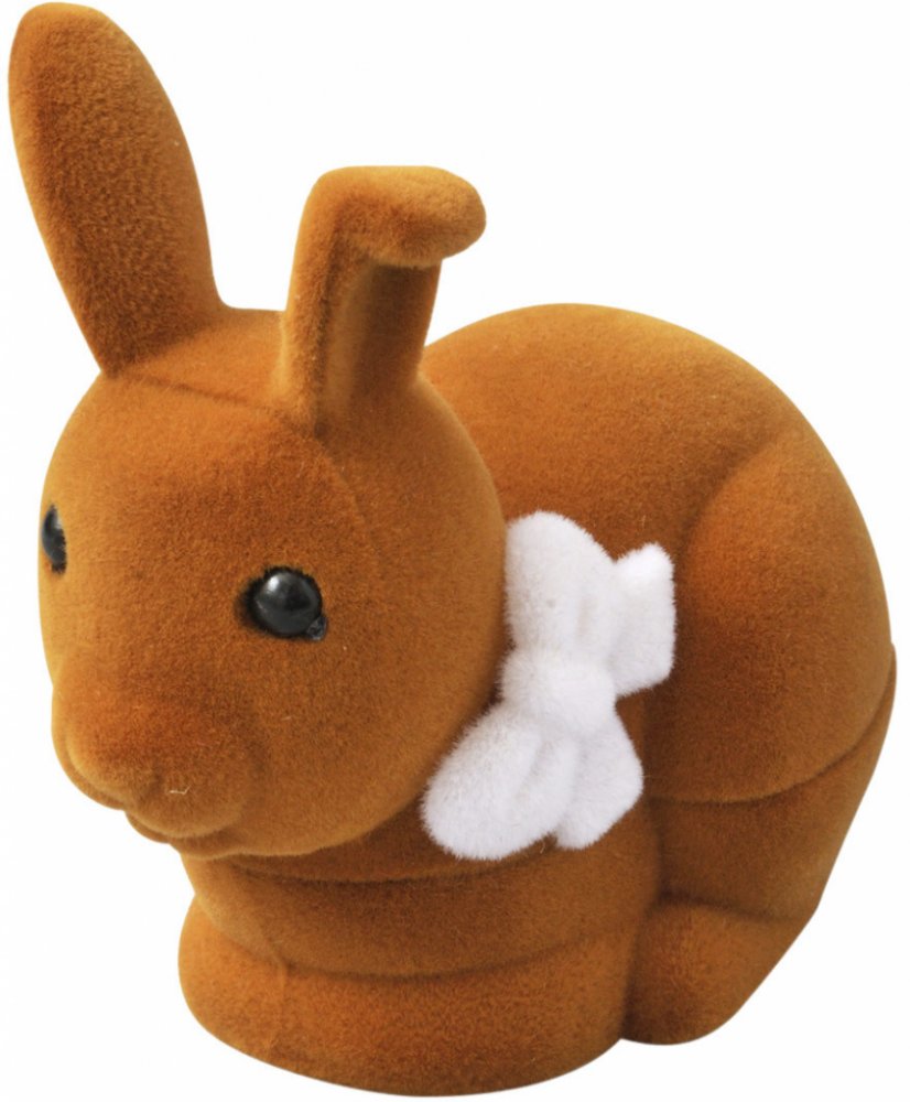 Atypická sametová dárková krabička ve tvaru králíčka s bílým saténem uvnitř víčka.