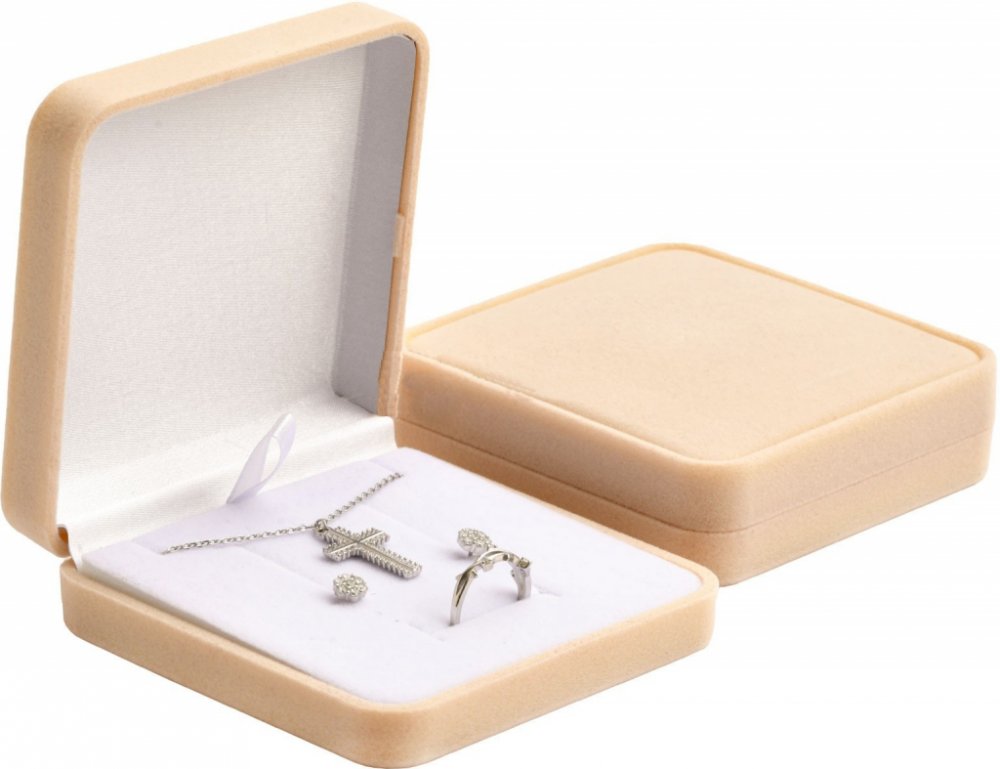 Sametová krémová dárková krabička s bílým saténem uvnitř víčka.
