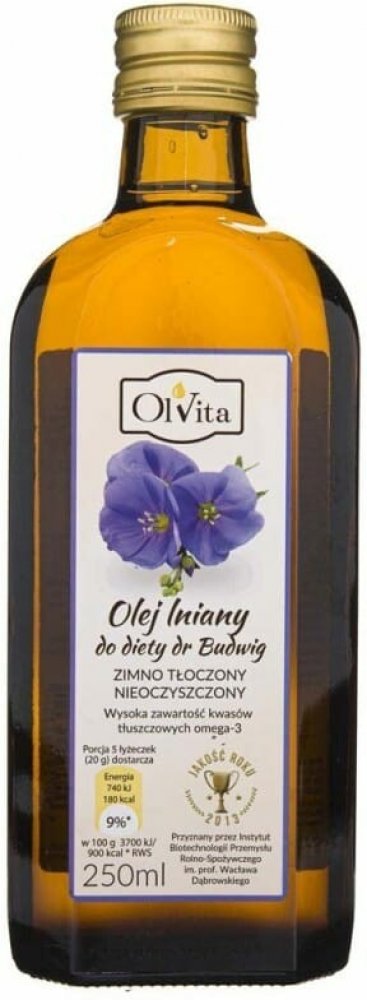 Olej se lisuje z pečlivě vybraných a testovaných lněných semen s vysokým obsahem kyseliny alfalinolenové. Vyznačuje se typickým lněným aroma a žlutou barvou. Lněný olej pro dietu Dr. Budwig se od běžného lněného oleje výrazně liší obsahem omega-3 mastných kyselin. Vyznačuje se vysokým obsahem UNS aturovaných mastných kyselin, včetně omega-3 mastných kyselin (více než 50 g/100 g oleje). Kromě toho, obsahuje v oleji přirozeně se vyskytující vitamin E. Kyselina linolová (LA) a kyselina alfa-linolenová (ALA) pomáhají udržovat normální hladinu cholesterolu v krvi. Příznivé účinky se projevují při příjmu: 10 g LA denně a 2 g ALA denně. Nahrazení nasycených tuků ve stravě UNS aturovanými tuky pomáhá udržovat normální hladinu cholesterolu v krvi. Kyselina olejová patří mezi UNS aturované tuky. Udržení dobrého zdraví vyžaduje vyváženou stravu a zdravý životní styl. Doplňky stravy Fakta: Velikost balení: 250 ml Doplňkové informace Množství v jedné porci % denní hodnoty Energetická hodnota 740 kJ / 180 kcal 9% Tuk 20 g 29% Nasycené mastné kyseliny 2 g 10% Mono UNS aturované mastné kyseliny 4 g * Poly UNS aturované mastné kyseliny 14 g * Sacharidy z toho: cukry 0 g 0 g * Bílkoviny 0 g * Sůl 0 g * * Denní hodnota není stanovena. Informace o alergenech: může obsahovat: Lepek, sezam, sóju, ořechy: arašídy, lískové ořechy, vlašské ořechy, makadamové ořechy, mandle. Doporučené použití: K přímé konzumaci nebo jako přísada do salátů, salátů, polévek, omáček, obilovin, brambor nebo jiných pokrmů. Ideální jako přídavek do zeleninových šťáv, smoothies a dezertů. Zahřívání oleje se nedoporučuje. Olej užívejte nalačno: 1 polévková lžíce, pomocný prostředek při zácpě.