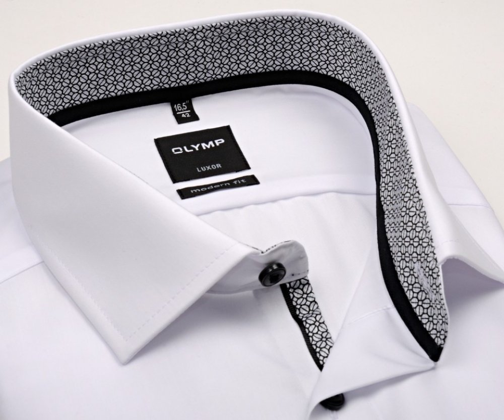 O této košili Olymp Modern Fit Materiál košile Materiál košile Olymp je ze 100% vysoce kvalitní bavlny. Druh tkaniny je Popelin (popelín) což představuje hladký a odolný materiál. Košile je velice příjemná na dotek i na nošení. Materiál košile je nežehlivý. Střih košile Košile je z řady Luxor Modern Fit (dříve označovaná jako Slim line) – tj. vyštíhlený, zúžený střih s vybranými boky, který se hodí k normální postavě. Límec košile Límec košile je tzv. Kent. Kapsička Košile má náprsní kapsičku. Délka rukávu a košile Košile má krátký rukáv. Délka košile se liší podle velikosti. Konkrétní údaj naleznete v tabulce velikostí - ta je zobrazena jako poslední obrázek v pořadí nebo ve spodní části každé stránky v sekci Tabulka velikostí. Barva a provedení košile Košile je bílá. Košile má vnitřní límec a légu v černo--bílém provedení s jemnou strukturou. Vzor tvoří půlené drobné kroužky řazené do diagonálních linií. Jejich střed je světle šedý. Košile má ve spodní části vnitřního límce černý pásek. Knoflíčky jsou antracitové tak hezký kontrast. Košile je příkladem tradiční bílé košile v moderním a zároveň elegantním provedení. Shrnutí - k čemu se košile hodí Košile má krátký rukáv. Nejlépe proto bude vypadat k samostatným kalhotám. Obecně o košilích Olymp Základní charakteristika Košile Olymp jsou v posledních letech nejrychleji rostoucí značkou košil v Evropě. Firma Olymp byla založena v roce 1951 v Německu rodinou Beznerů a dodnes je rodinným podnikem. To ji umožňuje držet se své filozofie vyrábět špičkové košile a nedělat přitom kompromisy. Kvalita je základ košil Olymp Od svého založení pracuje Olymp s cílem vyrábět a nabízet kvalitní výrobky, které budou pro ostatní značky příkladem. Košile Olymp se po celou dobu vyznačují vysokým důrazem na kvalitu použitého materiálu, kvalitu zpracování, vynikající komfort při nošení a vynikající poměr mezi cenou a kvalitou. Velký důraz klade Olymp také na módnost svých kolekcí a snaží se určovat módní trendy. Košile Olymp se vyrábějí v Asii. Proč si vybrat košili Olymp Košile Olymp se při nošení nemačkají a po vyprání je není potřeba žehlit. Stačí pouze pověsit na ramínko, zapnout knoflík na límci a ráno je košile připravena v perfektním stavu. Díky vysoce kvalitnímu materiálu a nežehlivé úpravě zůstane košile v perfektním stavu po celý den. Košile Olymp se velmi komfortně nosí a je příjemná na dotek. Špičkový materiál a velmi kvalitní zpracování poznáte na sobě nejen vy sami, ale i vaše okolí. Košile Olymp velmi dobře vypadají a padnou.