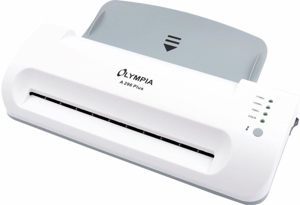 Olympia A 296 Plus je kvalitní laminátor vybavený regulací teploty, díky čemuž dosáhnete optimálních výsledků laminace. Nahřeje se během 3 až 5 minut. Laminovat můžete dokumenty formátu A4 nebo menší (šířka vstupu je 230 mm), a to do fólie o tloušťce 75 až 175 mikronů. Laminace jednoho papíru A4 trvá cca 1 minutu.