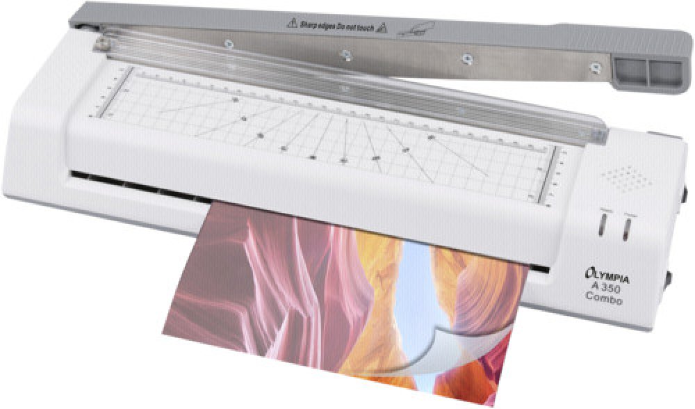 Olympia A 350 Combo Laminator for hot and cold laminating With foil jam release lever and corner rounding Formats up to DIN A3 possible Laminating width: 330 mm Compact, modern design High-quality heating system avoids lumps Automatic shut-off during overheating Max. warm-up time: 3-5 min Foil strength: 75-125 micron Laminating speed: 250 mm/min Max. laminating strength: 0.5 mm Display: LEDs for POWER and READY Lever-action cutter for 8 sheets of paper (80 g/m2) or 1 laminated foil Power supply: 220-240 V / 50 Hz / 430 W Power cord: 1.35 m Dimensions: 438 x 158 x 80 mm Weight: 2.37 kg Including laminating foils: 2x DIN A4