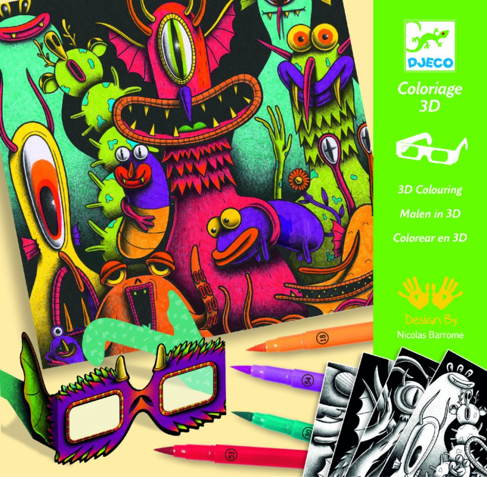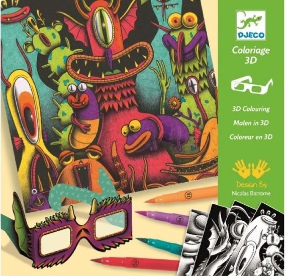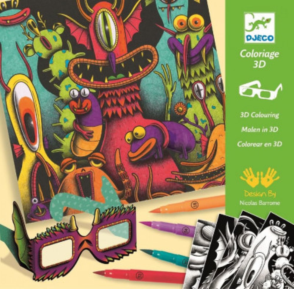 Téma příšerky - na nadcházející Halloween jak dělané! Sada 4 obrázků o velkosti 20 x 20 cm, které si prvně vybarvíte fixami, a pak se na ně díváte skrze brýle, s nimiž je uvidíte s 3D efektem! Vše je součástí - 7 fixů se dvěma hroty (jeden je klasický, jako náš fix, druhý je spíše jako štětec) a brýle v designu draka (s křídlemi u obrouček!). Fixy jsou očíslované, můžete tak obrázky vybarvovat pod...