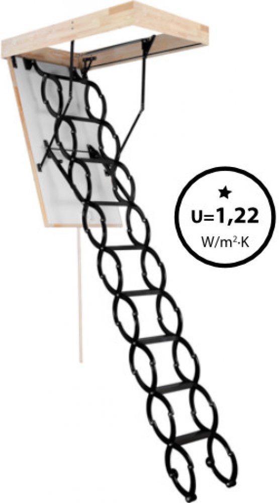 Půdní schody Oman Termo Nůžkové jsou velice oblíbené půdní schody. Oblíbené jsou pro svou jednoduchou ovladatelnost. Díky nůžkovému žebříku jde schody jednoduše roztáhnout pro výlez do půdních prostor a následně zatáhnout pro případ zavření schodů. Nůžkov Půdní schody Oman Termo Nůžkové jsou velice oblíbené půdní schody. Oblíbené jsou pro svou jednoduchou ovladatelnost. Díky nůžkovému žebříku jde schody jednoduše roztáhnout pro výlez do půdních prostor a následně zatáhnout pro případ zavření schodů. Nůžkový žebřík roztahujete a stahujete jako harmoniku. Tyto stahovací půdní schody slouží jako jednoduchý, praktický a zateplený výlez do půdních prostor. Nůžkové schody chody mají zateplené 26mm silné víko, které je z pohledové strany opatřeno bílou HDF deskou. Víko je zatepleno 20mm polystyrénem. Schody Nůžkové Termo jsou vyráběny pro maximální výšku podlaží 290cm a mají 13,5 cm vysoký dřevěný rám. Schody mají celokovový výlezový stahovací žebřík s nášlapy s protiskluzovou úpravu. Maximální možné zatížení pro Nůžkové půdní schody je 150kg. Součástí balení je stahovací tyč, sada pružin pro snadné otevírání a zavírání schodů a zavírací mechanismus (zámek) - schody tedy stačí rozbalit a namontovat. Výsuvné půdní schody Nůžkové Termo jsou ideálním řešením půdního výlezu pro nenáročné uživatele a hodí se všude tak kde není kladen vysoký nárok na energetickou úspornost objektu.Součinitel prostupnosti tepla U= 1,22W/m2*k.