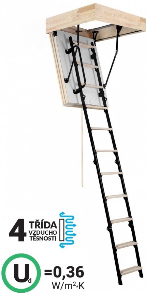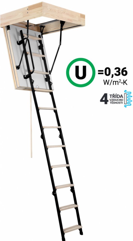Půdní schody Oman Mini Polar jsou ideálním řešením půdního výlezu pro prostory kde je málo místa s perfektními izolačními schopnostmi. Tyto skládací půdní schody slouží jako jednoduchý, praktický a zateplený výlez do půdních prostor. Schody Mini Polar mají zateplené 86 mm silné víko, které je z pohledové strany opatřeno bílou HDF deskou. Víko je zatepleno 80 mm polystyrénem. Schody Mini Polar jsou vyráběny pro maximální výšku podlaží 265 cm a mají 170 mm vysoký dřevěný rám. Schody mají 4-dílný kombinovaný výlezový žebřík, nášlapy jsou dřevěné a mají protiskluzovou úpravu. Bočnice žebříku jsou vyrobeny z oceli a ošetřeny práškovou barvou. Maximální možné zatížení pro půdní schody Mini je 160 kg. Součástí balení je stahovací tyč, madlo, sada pružin pro snadné otevírání a zavírání schodů a zavírací mechanismus (zámek) - schody tedy stačí rozbalit a namontovat.Schody v zateplení POLAR obsahují 2 těsnění a splňují 4. třídu vzduchotěsnosti. Součinitěl prosutpnosti tepla U = 0,36 W/m2*K, jedno z nejlepších zateplení na trhu.