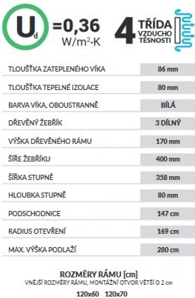 Dokonalý systém utěsnění víka a rámu napomáhá schodům plnit nejpřísnější normy. Schody dosahují 4 třídy vzduchotěsnosti dle EN 12207.