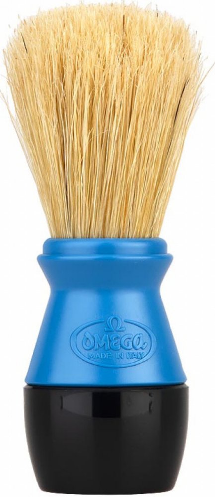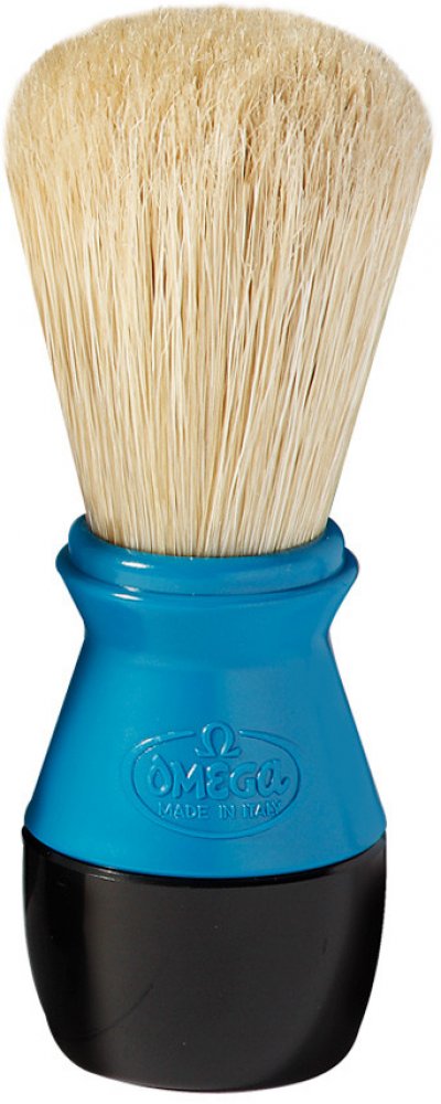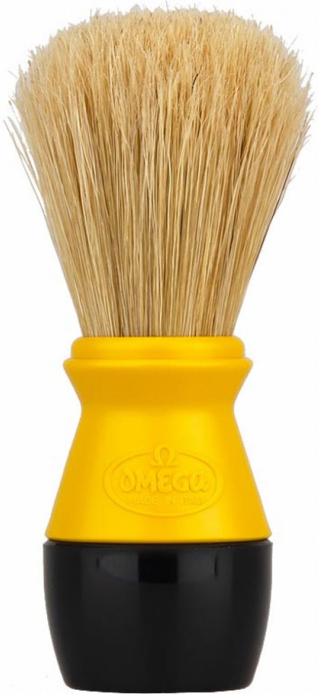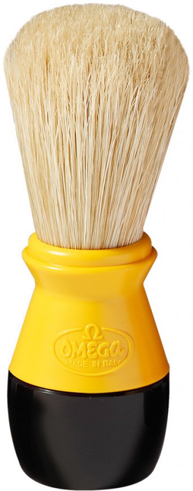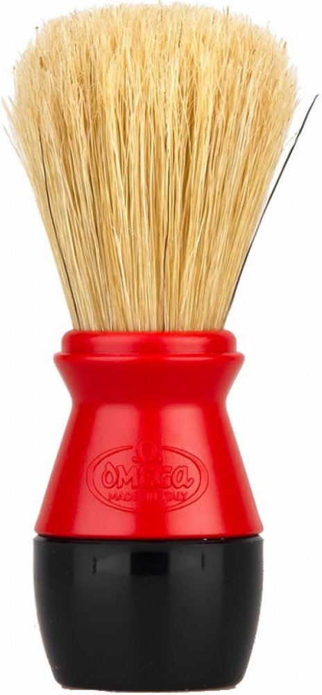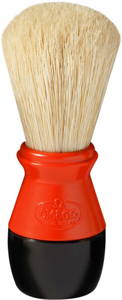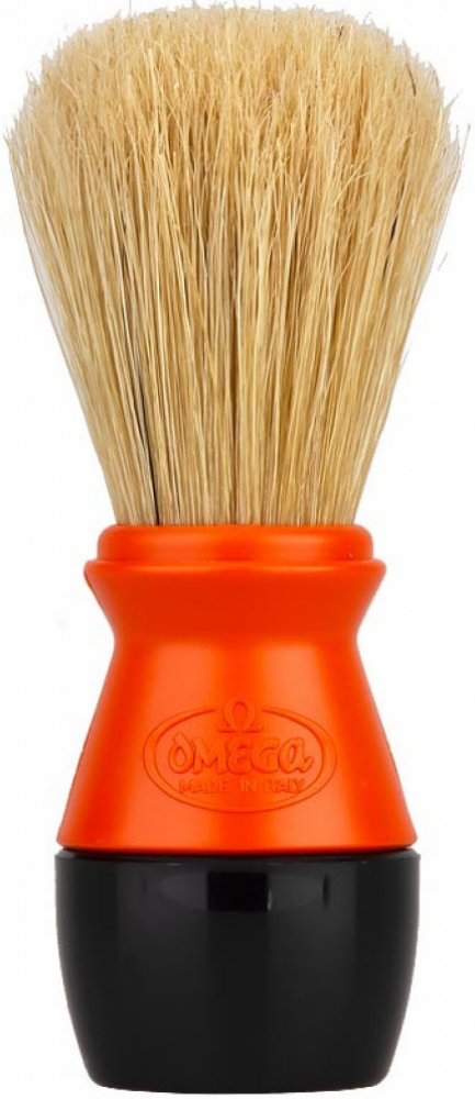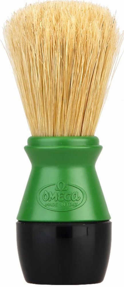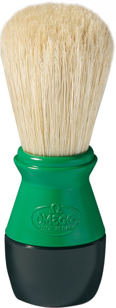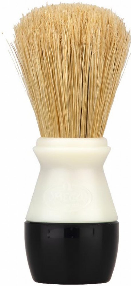 Štětka na holení Omega z prasečích štětin, které se vyznačují svou větší hrubostí oproti jezevčím štětinám. To však není na škodu, protože mají nejen silnější masážní efekt, ale taktéž při nanášení mýdla či pěny na holení efektivně odstraňují odumřelou pokožku. Rukojeť je vyrobena z plastu.