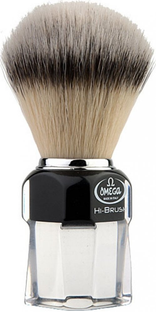 Štětky na holení s umělými štětiny Omega Hi-Brush jsou vyráběny z vláken polyesteru PBT (polybutylen-tereftalát). Bývají zbarveny v imitaci jezevčích štětiny typu Silvertip. Vlákna jsou jemně vlnitá pro lepší udržení pěny při šlehání a následné uvolňování pěny při nanášení na obličej.