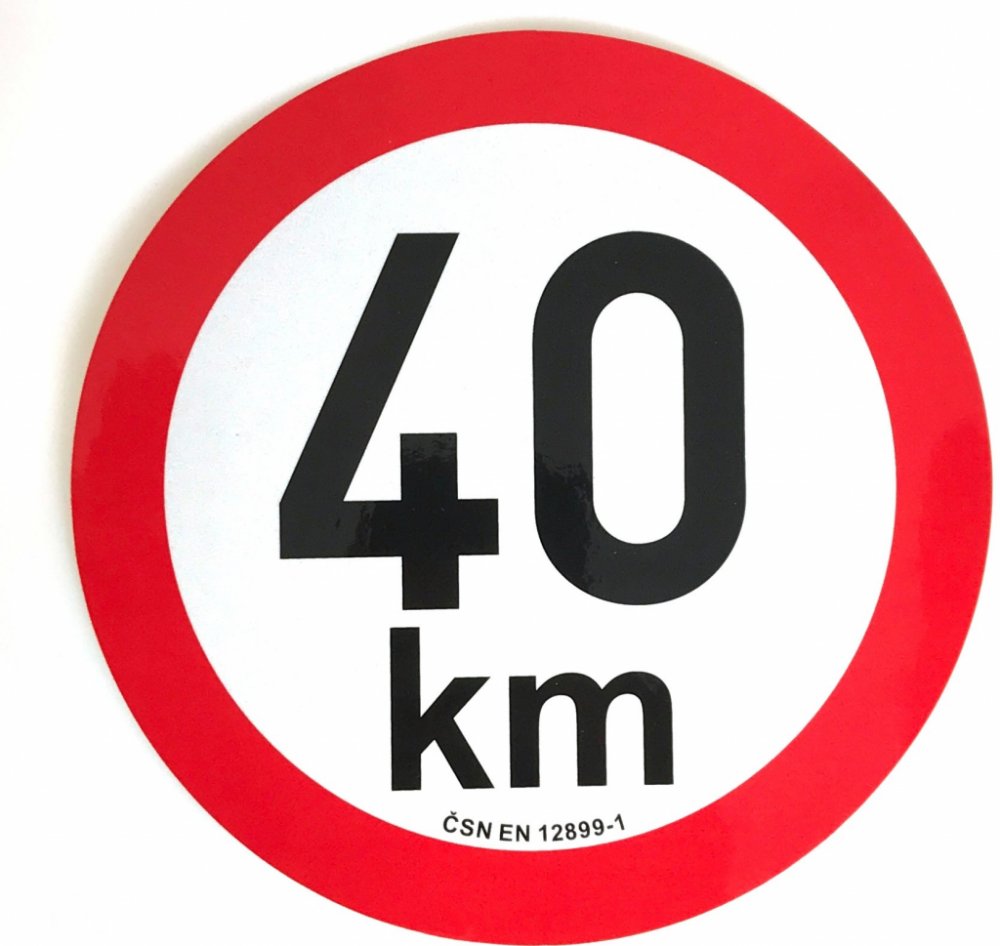 Samolepka průměr 200 mm s označením nejvyšší povolené rychlosti 40 km/h v provedení z retroreflexní fólie třídy 1 dle ČSN EN 12899-1, odpovídající platnému znění vyhlášky 341/2014 Sb.