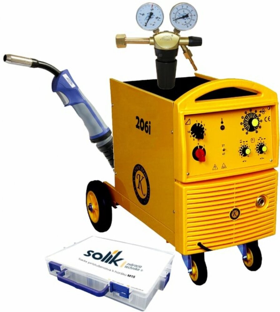 Český spolehlivý invertorový poloautomat s vysokovýkonným chlazením umožňuje použití dlouhodobého použití v dílnách i v těžkém průmyslu. Obsah balení setu svářečky OMI 206i Omicron: svařovací poloautomat OMI 206i Omicron, svařovací hořák CO2 - MIG/MAG M15 MOST SGRIP 4m, startovací sada na MIG/MAG (CO2) hořák M15 v kufříku, redukční ventil Argon/CO2 Brass MOST Plus DIN N2, zemnící kabel délky 3 m se svorkou, hadička čirá pro připojení plynu 1,2 m, kabel pro připojení ohřevu plynu, kladka pro drát o průměru 0,6 a 0,8 mm (dvojkladka nebo čtyřkladka), redukce pro drát 15–18 kg, návod k obsluze, záruční list. Svářečka OMI 206i 4-kladka možnost elektronického nastavení délky bodu, pomalých pulzů a přepnutí stroje do režimu čtyřtakt - tyto funkce jsou řízeny mikroprocesorem, 4kladkový posuv drátu, eurokoncovka pro připojení hořáků 3 m, 4 m, 5 m, zdroj svařovacího proudu, zásobník drátu a posuv drátu jsou v jedné kompaktní plechové skříni, 2 pevná a 2 otočná kola pro přemisťování svářečky, madlo pro jednodušší manipulaci, zdroj svařovacího proudu se strmou charakteristikou, vyrobena z materiálů, které neobsahují toxické nebo jedovaté látky pro uživatele. Funkce poloautomatu OMI 206i redukce otáček posuvu drátu, nastavení délky bodu, nastavení délky zpoždění, přepínání mezi 2-/4-takt, nastavitelný předfuk plynu, nastavitelný dofuk plynu, nastavitelný čas dohoření proudu, nastavitelné bodování. Svářecí režimy svářečky plynule 2-/4-takt, bodové svařování 2-/4-takt, pulzní svařování 2-/4-takt. Režimy svářečky se nastavují pomocí dvou potenciometrů. Přepnutí mezi 2-taktním a 4-taktním režimem pomocí přepínače. Použití svařovacího poloautomatu OMI 206i svařování tenkých, středních a větších tloušťek materiálů při použití drátu od 0,6–1,0 mm, při použití vhodné ochranné atmosféry můžete svařovat všechny druhy nízkolegovaných a konstrukčních ocelí, je možné svařovat i hliník a jeho slitiny, je však třeba použít speciální kladku s "U" profilem, drát průměru 1,0 mm ze slitin AlMg3 nebo AlMg5, teflonový bowden a speciální proudovou špičku. Jako ochrannou atmosféru je třeba použít čistý argon. Pro svařování hliníku je určena min. tloušťka plechu 2 mm.