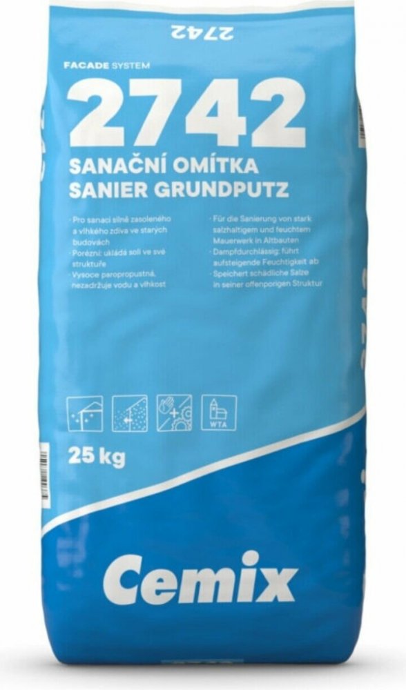 Sanační omítka Cemix 2742 pro sanaci silně zasoleného a vlhkého zdiva ve starých budovách.PoužitíPro vyrovnání podkladu při sanaci vlhkého zdivaPro vysoce zasolené a vlhké konstrukcePro vyrovnání velkých nerovností při sanaci vlhkého zdivaPro ruční a strojní zpracováníVlastnostiSplňuje požadavky WTAVysoce paropropustnáPorézníTechnické parametryAplikační teplota: 5 °- 30 °CZrnitost: 1,2 mmZpracovatelnost: 90 min.Spotřeba: 1,05 kg/m²/mmBalení: 25 kg