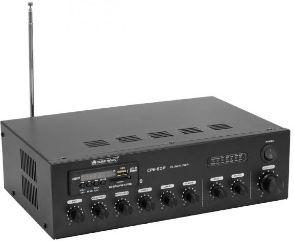 100V mixážní zesilovač z kolekce CPE s výkonem 1x 60W RMS. Možnost zapojení reproduktorů s nižší impedancí (4-16 ohmů). Zesilovač umožňuje přehrávat hudbu z několika zdrojů: SD, USB, Bluetooth, FM rádio. Možnost ovládání pomocí IR dálkového ovládání (součástí balení), přehlednost je pak zajištěna 4-řádkovým LED displejem. Perfektní konektivita zajištěna pomocí mikrofonních a linkových vstupů se samostatným ovládáním hlasitosti. Využijete jistě i praktického bezdrátového streamování pomocí technologie B