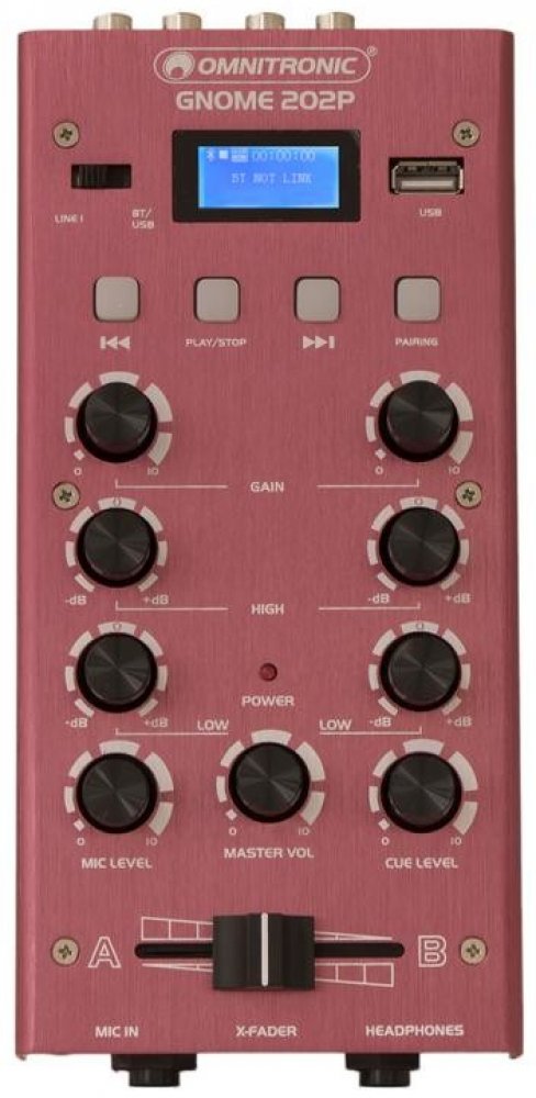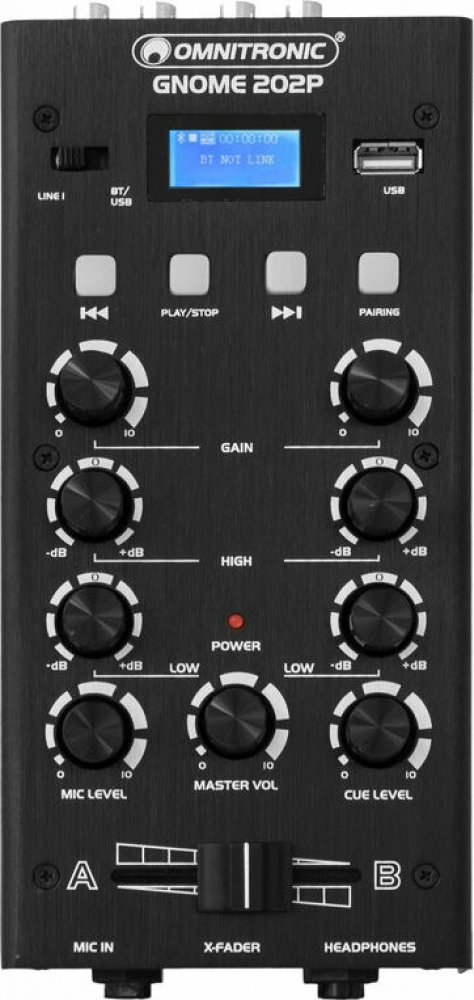 2 kanálový stereo mini DJ mixer, LCD display s MP3 přehrávačem, USB vstupem a Bluetooth. Regulace vstupní úrovně signálu a 2 pásmovou korekcí zvuku, připojení pomocí RCA konektorů. Mikrofonní vstup a sluchátkový výstup Jack 6,3 mm s regulací hlasitosti, crossfader pro přepínání signálu mezi kanály. Robustní odolné pouzdro z eloxovaného hliníku.
