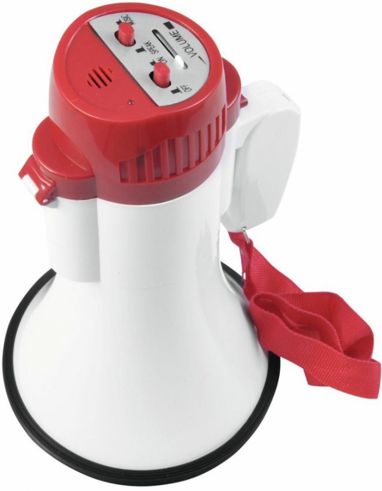 Kvalitní megafon, konstrukce odolná vůči oděru. Ovládání hlastitosti a zapínání přímo na držadle. Napájení 1,5V bateriemi.