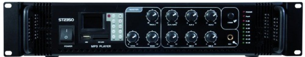 Výkon 1x 120W RMS. Možnost zapojení reproduktorů s nižší impednancí (4-16 ohmů). Zesilovač umožňuje přehrávat hudbu (soubory WAV, WMA, MP3) z několika zdrojů: SD, USB, AUX input. Možnost ovládání MP3 přehrávače pomocí dálkového ovládání. Informace zobrzauje pomocí LCD displaye. Dále zesilovač nabízí 3 mikrofonní vstupy s možností samostatného nastavení hlasitosti. 1 stereo výstup (RCA). Korekce k ...