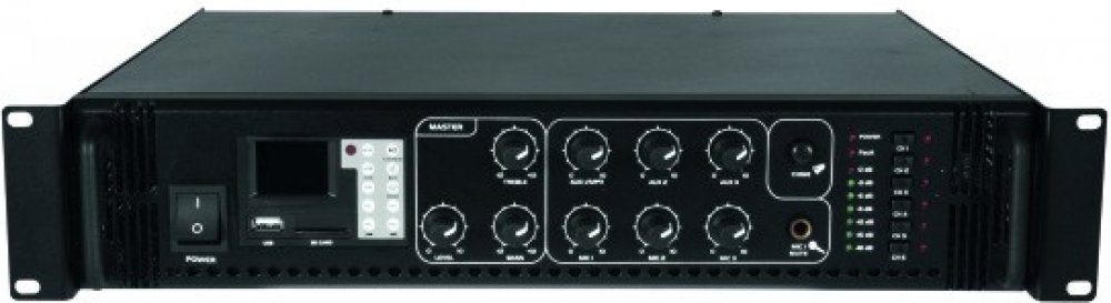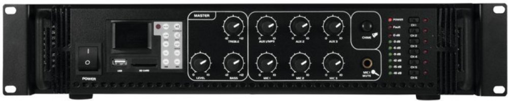 Comfortable control of PA speakers via 6-zone technology. 6 PA zone outputs, independently switchable on the front panel. Master PA output (70 V and 100 V). Output for low-impedance speakers (4-16 ohms). MP3 player with IR remote control and LCD with blue backlight. SD card slot and USB input . Folder navigation and repeat functions (1, All). 2 rear microphone inputs (6.3 mm jack, unbal.). 1 front...