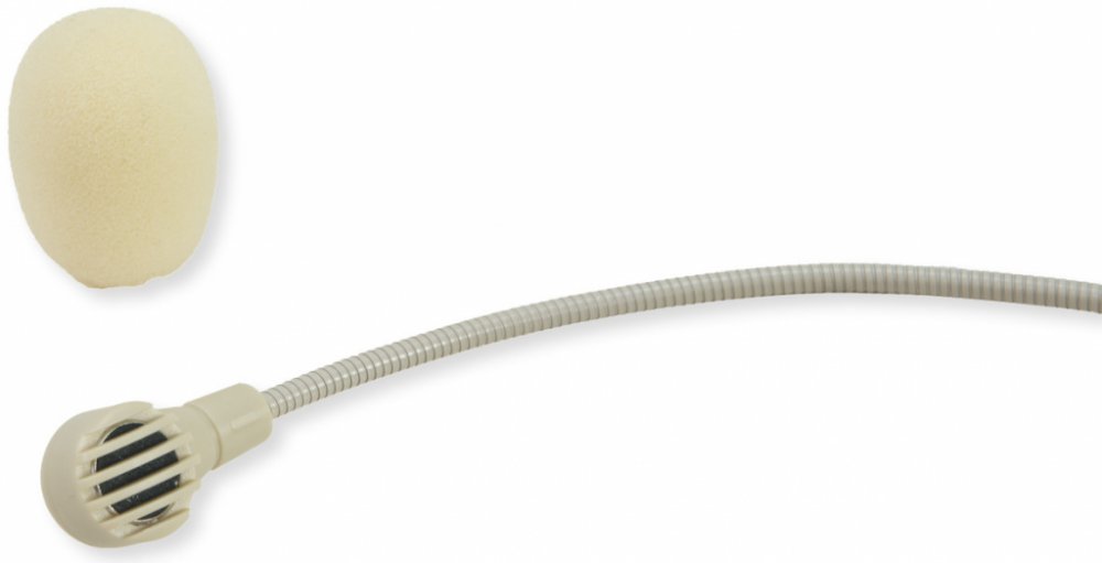 Kardioidní kondenzátorový mikrofon pro bodypack Omnitronic UHF 200 BP, lehká konstrukce, jednostranné vedení kabelu s konektorem mini jack 3,5 mm, molitanový větrný kryt, tělová barva.