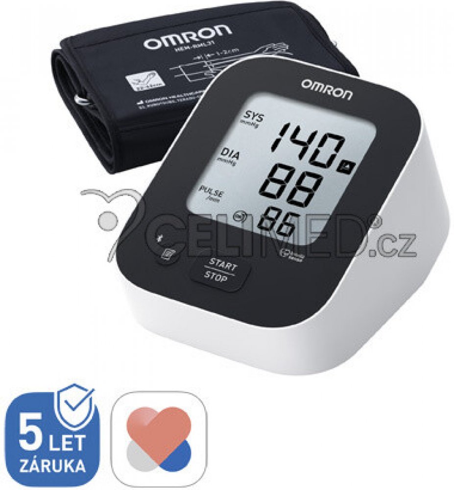 SMART tonometr na paži, bluetooth připojení na aplikaci Omron Connect pro Android/iOS. Intellisense technologie, paměť 1x30, manžeta Easy-L (22-42cm) pro normální i silnou paži. Indikátor nepravidelného pulsu/arytmií.