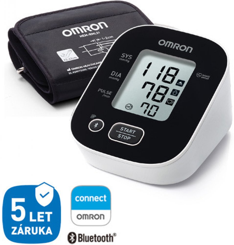 Omron bílé, černé bateriové 30 měření na paži pro cestování (na baterie) klinicky validované pro jednoho uživatele oscilometrické automatické 250 g 103 x 82 x 140 mm 170 g univerzální dvoudílná s hadičkou pro synchronizaci s telefonem (Bluetooth/aplikace)