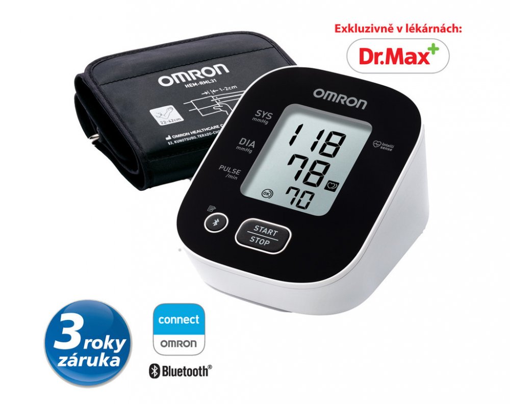 Omron bílá, černá na paži oscilometrické automatické pro synchronizaci s telefonem (Bluetooth/aplikace) univerzální dvoudílná s hadičkou