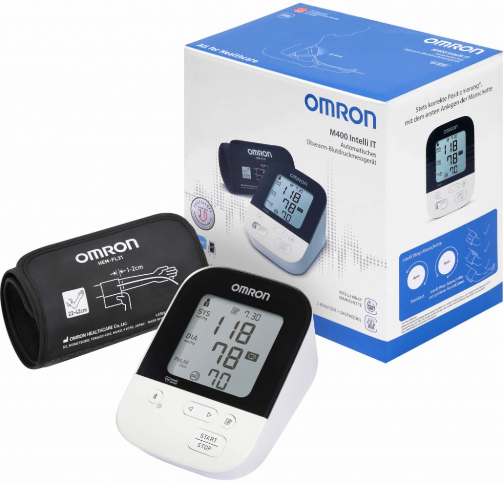 OMRON M400 Intelli IT je automatický monitor krevního tlaku na rameno s detekcí arytmie. Dodává se s manžetou Intelli Wrap (22-42 cm), která je vybavena integrovaným pohybovým senzorem, který snímá pohyby během měření a tím snižuje chybovost. Kromě toho je zde ovladač polohy manžety, který ukazuje správnou polohu manžety.