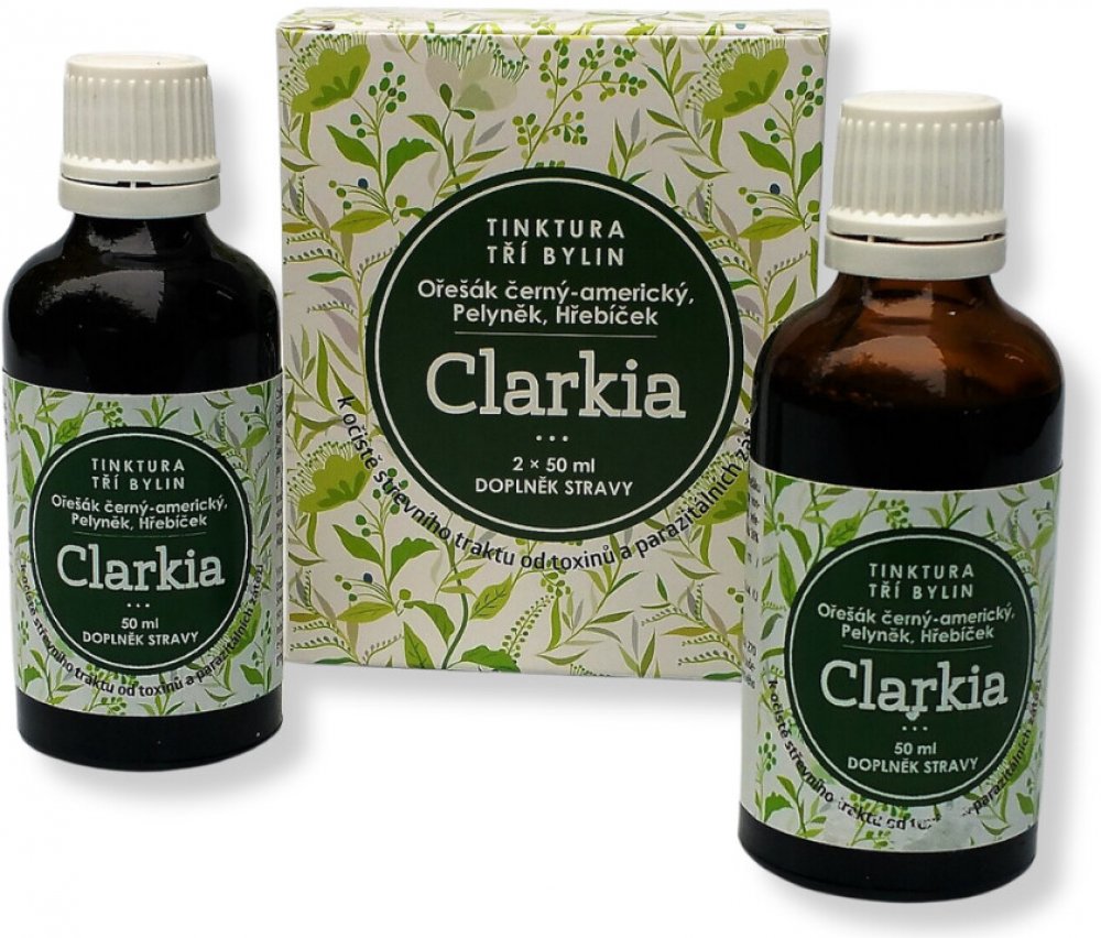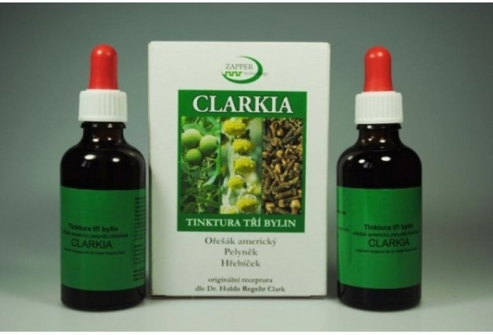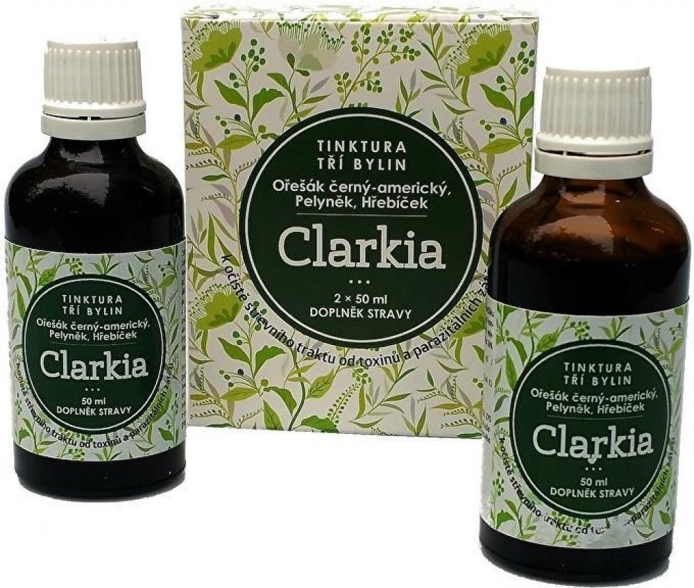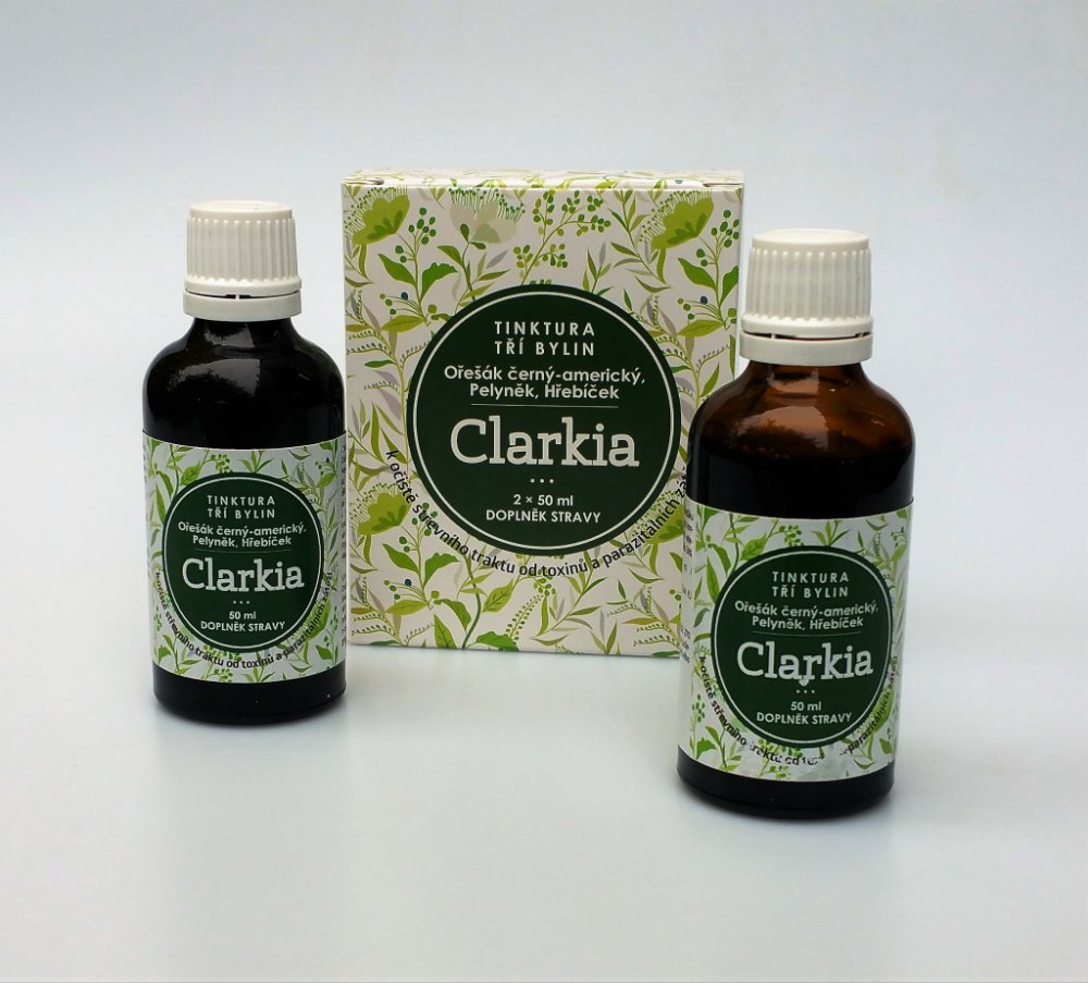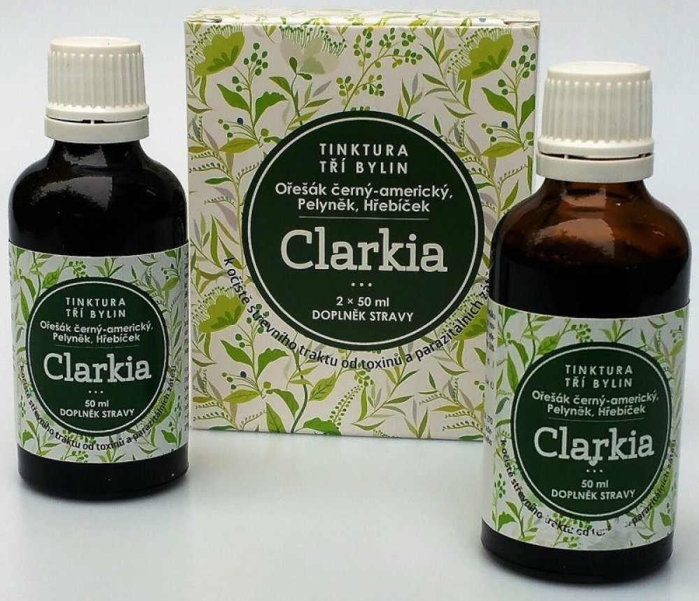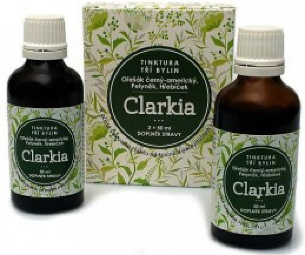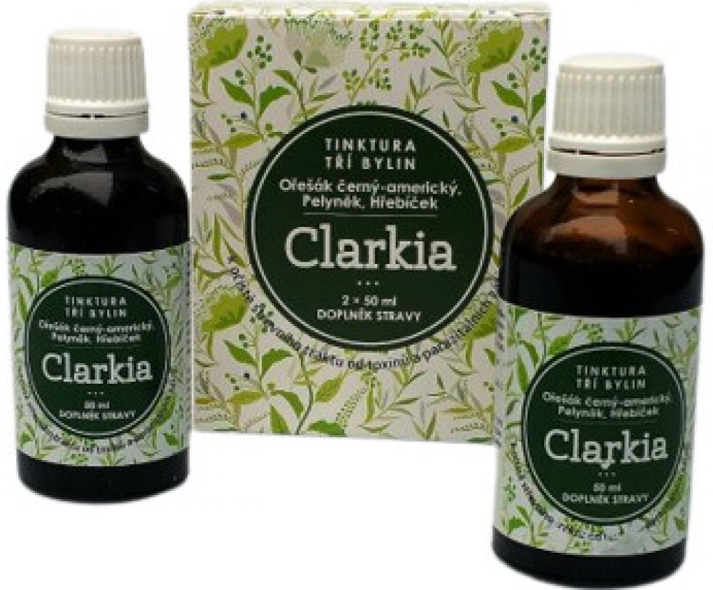 Tinktura Clarkia je směsí tinktury z Ořešáku amerického, výluhu z hřebíčkovce kořenného a pelyňku. Jedná se o přesné složení, které Dr.Clarková doporučuje pro očistu zažívacího ústrojí od parazitální zátěže. Tinktura Clarkia se vyrábí komplikovaným výrobním způsobem hlubokého zmrazování. Použité suroviny nebyly jakýmkoliv způsobem znečištěny či průmyslově hnojeny. Výroba je pod dozorem státních orgánu a Tinktura tří bylin Clarkia je notifikována Ministerstvem zdravotnictví ČR.