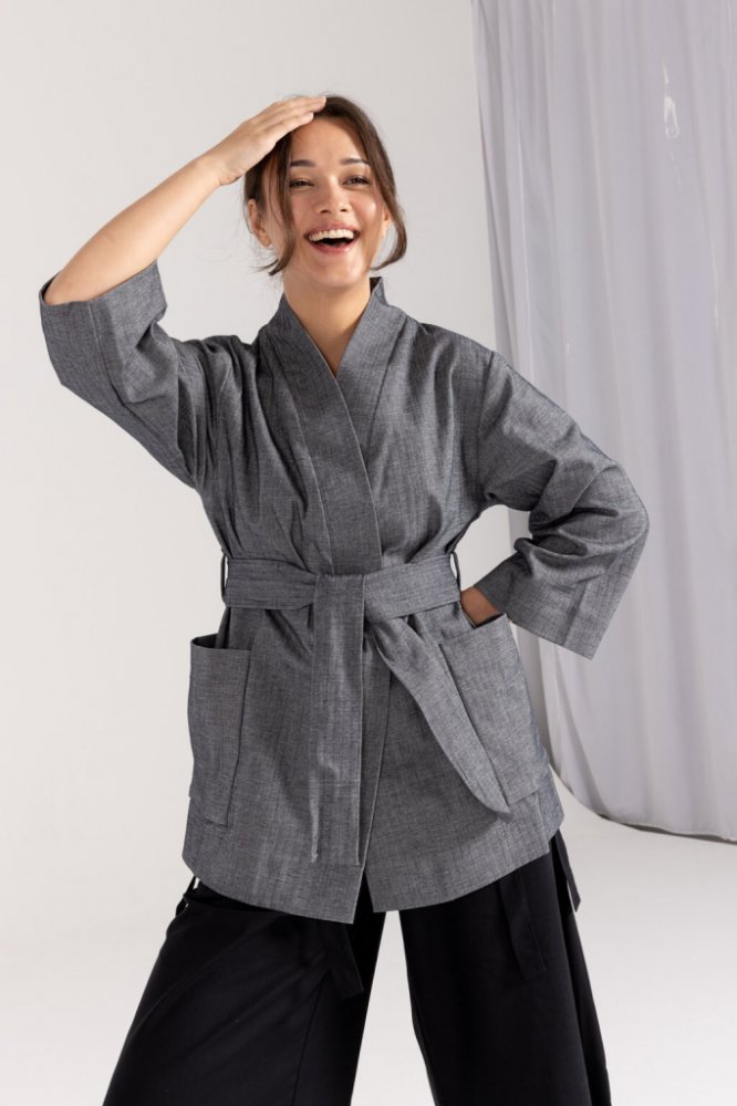 Zavinovací kimono AKI oceníte pro jeho nadčasovost a jednoduché linie. Má velmi kvalitní řemeslné zpracování a je šité slepým stehem a obroubené šikmou stuhou. Velké nakládané kapsy s neviditelným švem přispějí k vašemu maximálnímu pohodlí. Máme jej ve dvou velikostech ve velkorysém rozsahu. Skvěle se kombinuje s kalhotami. Pas jednoduše zvýrazníte přiloženou vázačkou.