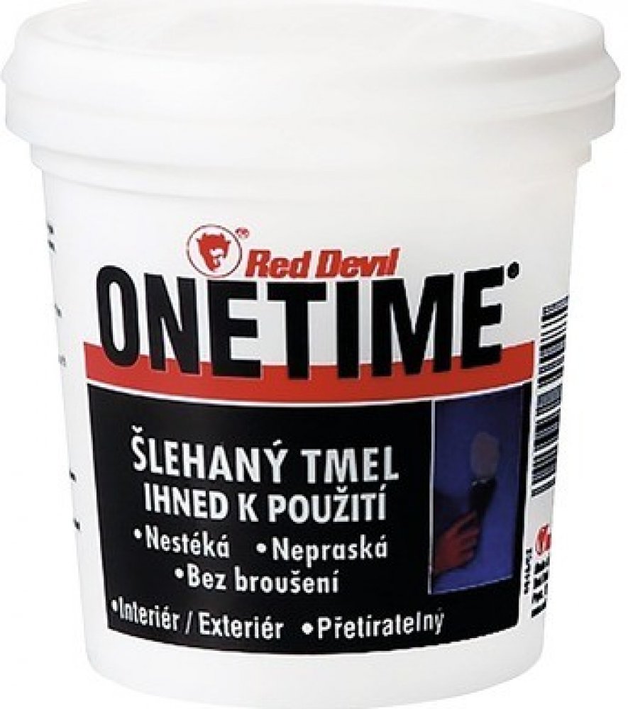 Návod k použití 1. Povrch musí být suchý, čistý, bez prachu, mastnoty a špatně přilnavých zbytků starých barev. 2. Pokud je tmel v nádobce zaschlý delším skladováním, přidejte čajovou lžičku vody na každých 200ml produktu a promíchejte. 3. Pomocí pružné špachtle vtlačte ONETIME® do otvoru nebo pukliny a povrch uhlaďte. 4. Vodou ředitelnými barvami lze přetírat po 2hodinách. ONETIME® po zaschnutí saje barvu, proto je doporučováno aplikovat více vrstev interiérového nátěru. Syntetickými barvami lze přetírat po 24hodinách. 5. V exteriéru ONETIME® vždy přetřete barvou.