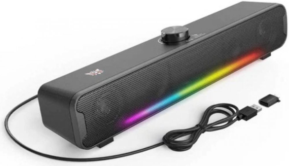 Elegantní černý design: Černá barva s RGB efekty dodává reproduktoru stylový vzhled, který zapadne do jakéhokoliv moderního prostoru.