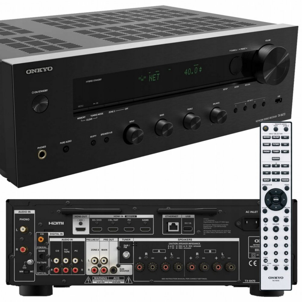 TX-8470 nabízí široké možnosti připojení: 3 RCA vstupy, phono MM/MC, 2 optické, 1 koaxiální a 4 HDMI 2.1 vstupy. Zlacené A/B terminály podporují 4–16 Ω reproduktory, což umožňuje připojení dvou párů repro. Ovládání je možné přes dálkový ovladač, Onkyo Controller app nebo hlasové asistenty (Google Assistant, Siri). Crutchfield.com (web:5) vyzdvihuje „snadnou integraci do smart domácností“.