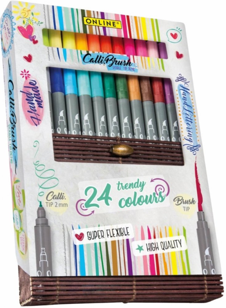 Do vaší sady malířských potřeb by jistě měly patřit fixy Online Germany. Fixy o šířce stopy 2 mm budou mít dostatečně výrazné tahy. Kaligrafické neboli štětcové fixy vám budou parťákem při vytváření různých ilustrací a ozdobných nápisů pomocí moderní kaligrafie. V balení můžete očekávat 24 kusů. Klíčové přednosti fixů Online Calli.Brush kaligrafické fixy 24 ks Fixy Online Germany vám pomohou s různým tvořením Fixy skvěle padnou do ruky Můžete je použít na papír Kaligrafické neboli štětcové fixy se hodí na moderní kaligrafii či lettering V balení dostanete 24 fixů Kvalitní hrot je zkosený a štětcový a šířka jeho stopy dosahuje 2 mm