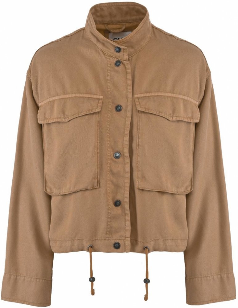 LEHKÁ JARNÍ BUNDA CAMEL Only: lehká jarní bunda dámská v elegantním hnědém camel tónu volný, kratší střih lehký a prodyšný materiál jarní bundy - 100 % lyocell - TencelTM bunda bez kapuce, se stojáčkem široké rukávy, spadlé ramenní švy zapínání na cvoky (6x) spodní lem lehké jarní bundy lze stáhnout pomocí tkaničky kapsy: 2x náprsní s klopou modelka vel. XS - 176 cm (88-65-98)