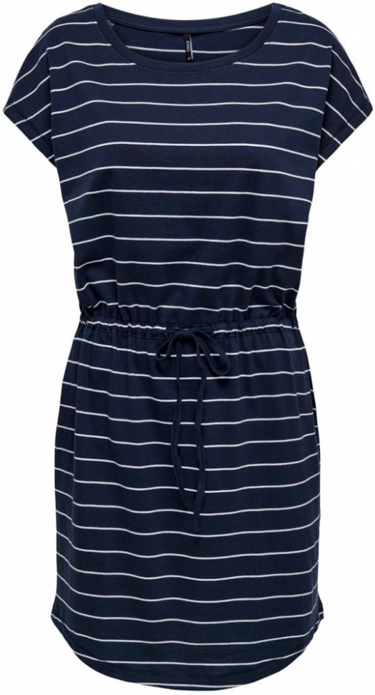 LETNÍ ŠATY S PROUŽKY Only: dámské letní šaty s proužky dánské značky Only lehký a na dotyk příjemný materiál kulatý výstřih, krátké rukávy mini délka - nad kolena vyrobené z organické bavlny šaty lze v pase stáhnout pomocí tkaničky kombinace tmavě modré/navy barvy a tenkých bílých proužků materiál letních šatů je strečový a přizpůsobí se tak postavě basic šaty do horkých letních dnů