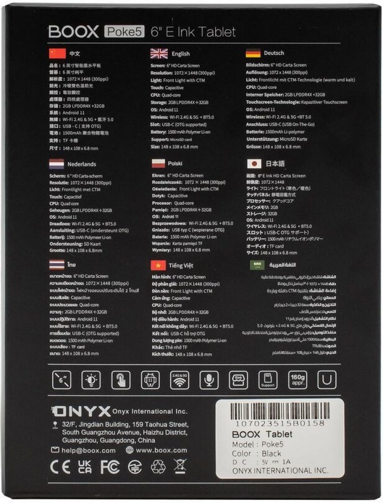 Onyx 6 " 160 g 32768 MB E-ink 1448 x 1072 px