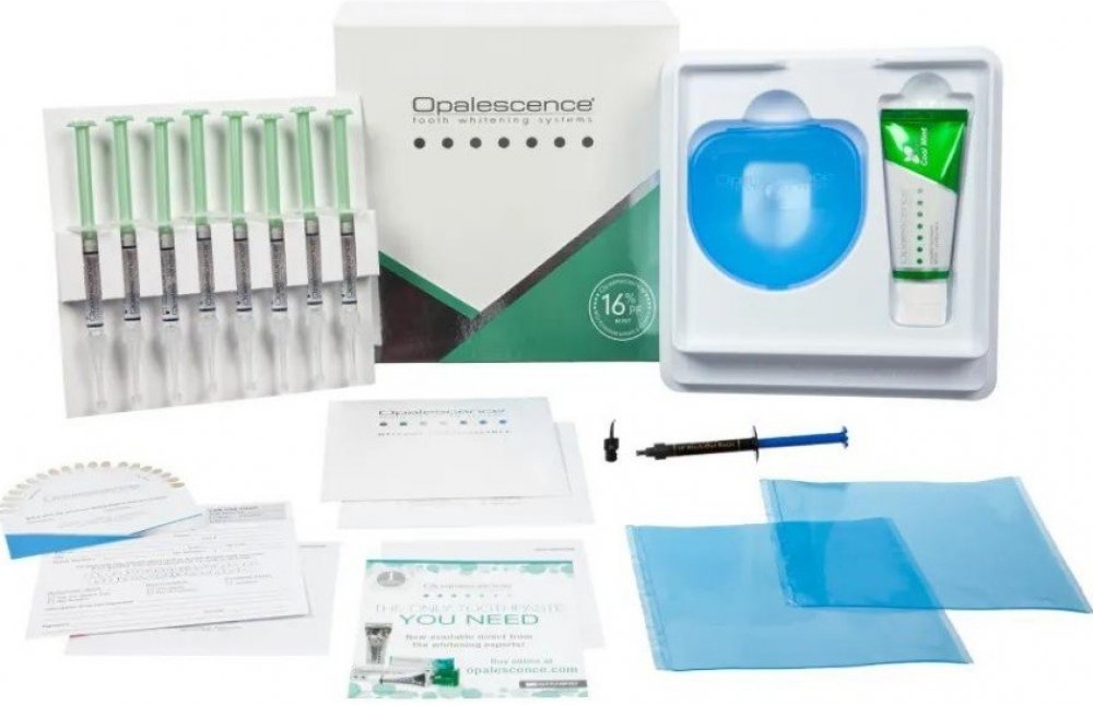 8 x 1,2 ml bělícího gelu PF 16%, 30 ml bělící pastu, krabičku na nosič, 1,2 ml LC Block-Out resin a 2 ks Soft-Tray fólií.