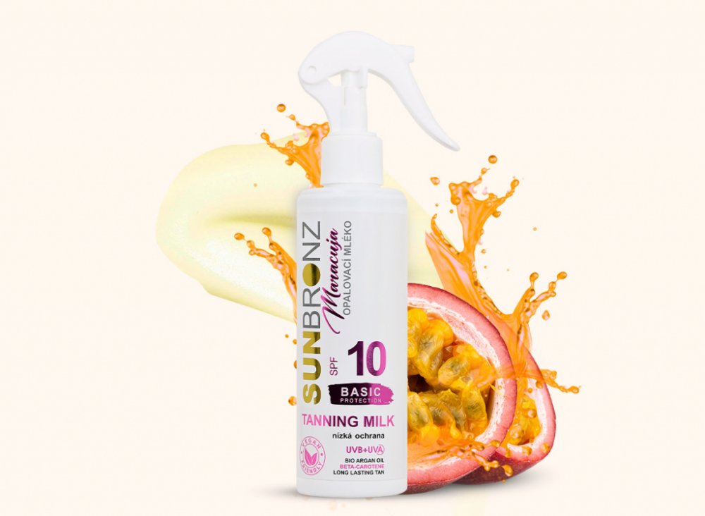Miluješ dlouhotrvající hluboký bronz? Pak vyzkoušej opalovací mléko SUN BRONZ SPF 10 s beta karotenem, které podporuje intenzivní zhnědnutí pokožky a zvýrazňuje bronzový efekt opálení. Zjemňující arganový a kokosový olej vyživují tvoji kůži a chrání ji před vysušováním a předčasným stárnutím. Bonusem je pak božská vůně tropické maracuji, která tvoji pokožku krásně provoní!