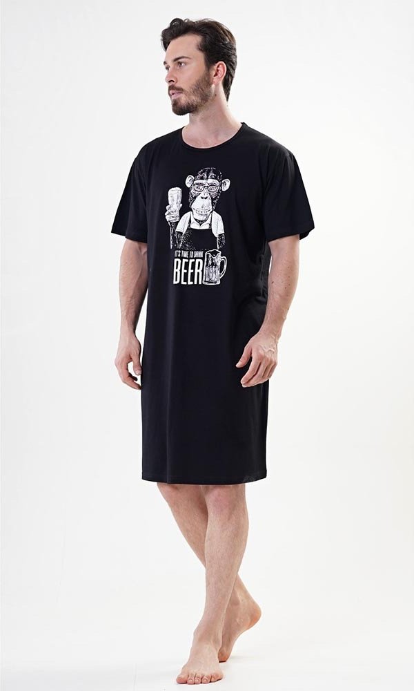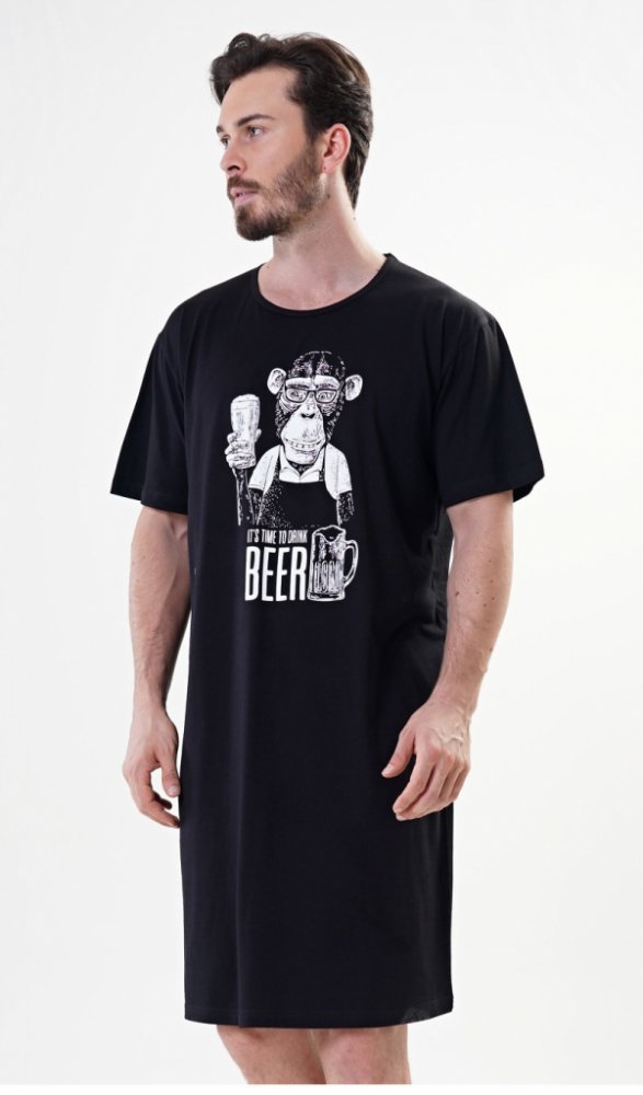 Pánská bavlněná noční košile s krátkým rukávem Opice. Pánská noční košile pro všechny milovníky pohodlí s obrázkem šimpanze - barmana s pivem. Použitý bavlněný materiál je příjemný a poddajný na dotek.