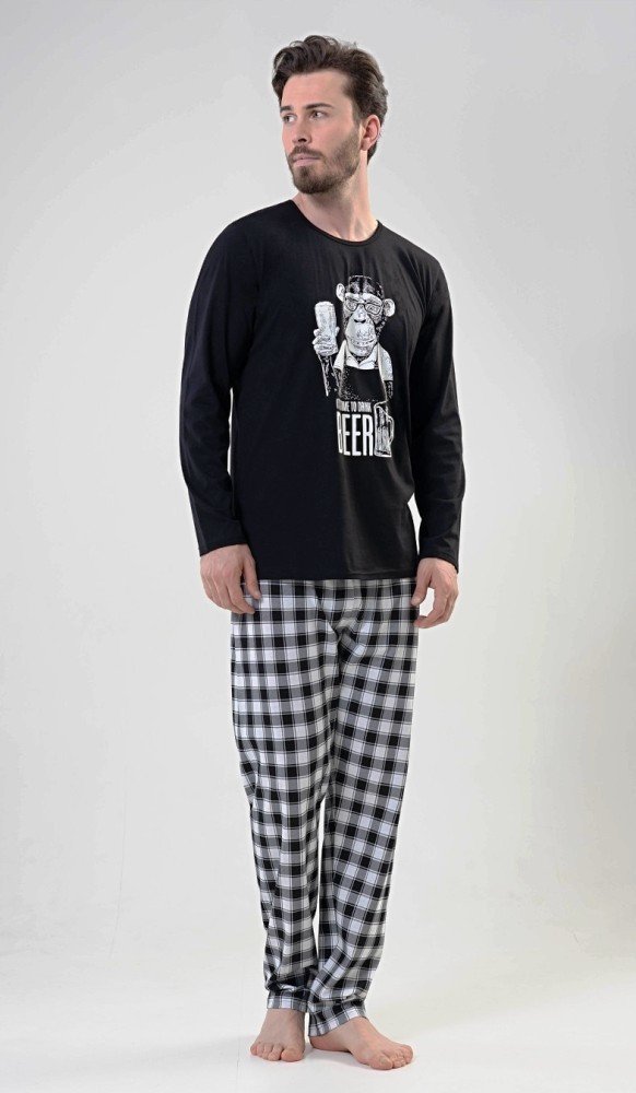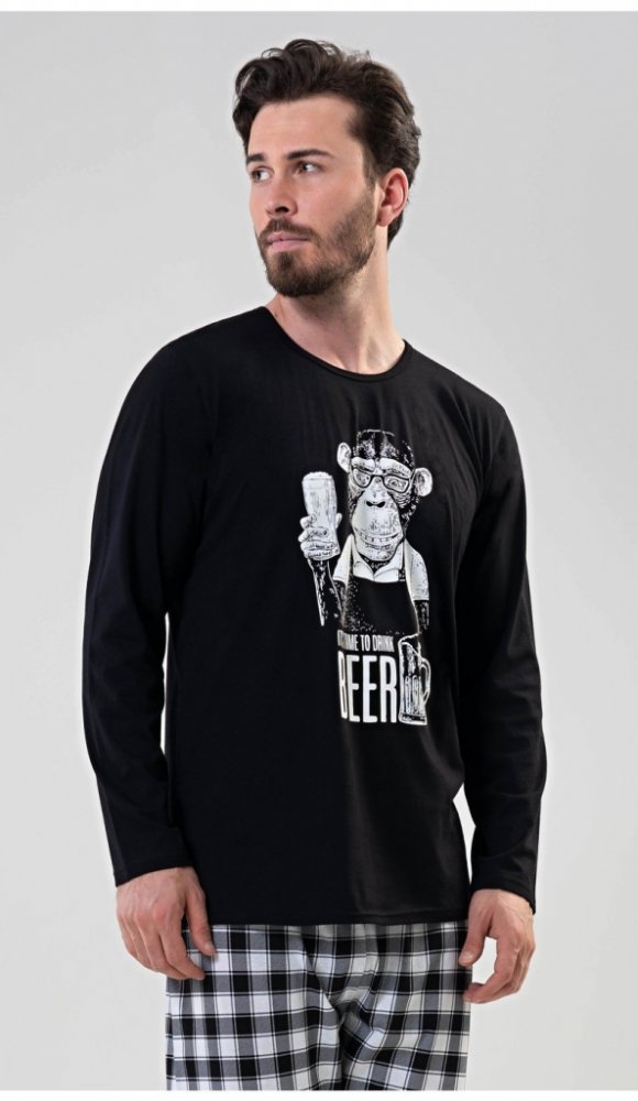 Pánské pyžamo Opice. Pánské pyžamo se skládá z trička s dlouhým rukávem a dlouhých kalhot. Na tričku je obrázek veliké opice s pivem. Kalhoty jsou kostkované. Použitý materiál je jemný a poddajný na dotek.