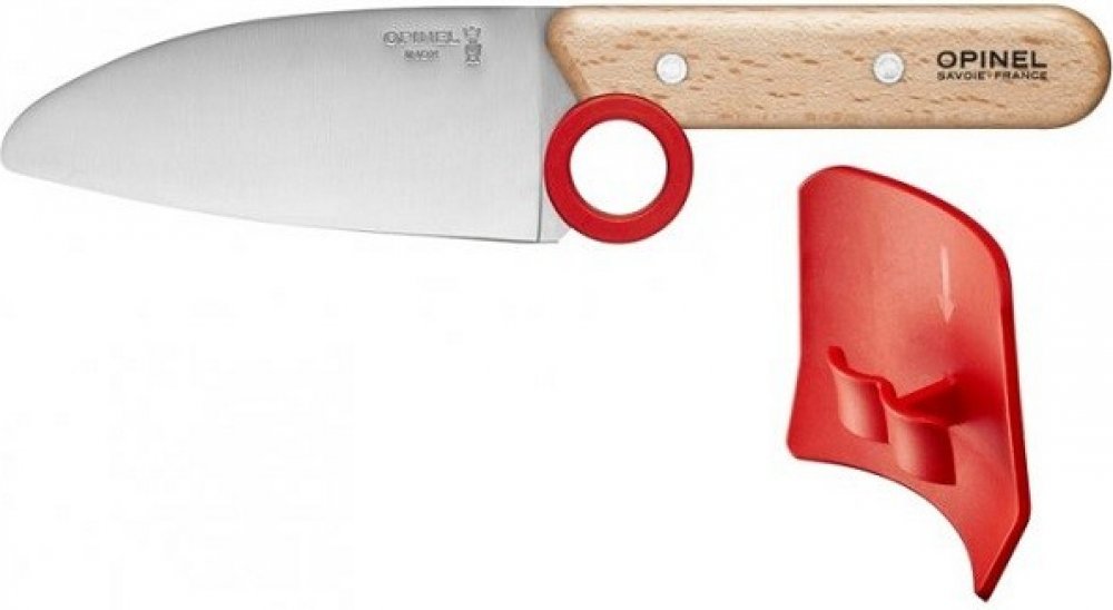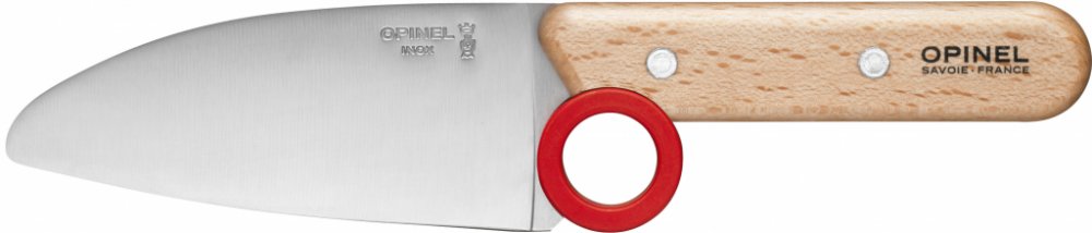 Zakulacená špička nože z nerezové oceli, které je 10 cm dlouhé a robustní je ideálním společníkem pro děti, které se chtějí naučit zacházet s nástroji v kuchyni. Ať už se děti učí krájet zeleninu na kostky nebo na plátky, tento nůž je pro ně ideálním společníkem. Silikonový kroužek umístěný mezi ostřím a rukojetí umožňuje dětem držet nůž správně a také chrání prsty před sklouznutím pod ostří nože. Chránič prstů je praktická pomůcka, která ochrání prsty - snadno se navlékne na ukazováček a prostředníček, palcem a prsteníčkem lze snadno přidržovat krájené potraviny Rukojeť z bukového dřeva, které má vynikající mechanické vlastnosti. Bukové rukojeti jsou lakované lakem, který byl velmi pečlivě vybrán, aby zušlechtil samotné bukové dřevo. Dřevo. 95% dřeva, ze kterého se vyrábějí rukojeti, pochází z udržitelně obhospodařovaných francouzských lesů. Nedochází k přílišnému kácení lesů a znečištění ovzduší při dlouhém transportu – tím vším je méně zatěžována příroda. Hlavní dodavatel dřeva má své lesní plochy ve francouzském regionu Jura a samozřejmě je držitelem PEFC certifikátu. Nerezová ocel. Výběr oceli je jeden z nejdůležitějších materiálů samotného nože. Určuje životnost a kvalitu samotného ostří. Pro nože značky Opinel byla vybrána vysoce kvalitní švédská ocel 12C27 (Sandvik). Tato ocel je vysoce odolná vůči korozi a jednoduchá na údržbu díky přídavku chromu. Přídavek uhlíku v oceli (0,40%) zajistí excelentní hranu, která drží tvar i při styku s tvrdším materiálem bez nutnosti broušení.Příběh ikonické značky Opinel začíná v 19. století kdy se obchodník Victor-Amédée Opinel během svých cest naučil, jak se kovají hřebíky a díky tomu založil svou první kovárnu ve Francii. Po jeho smrti převzal jeho řemeslo syn, Daniel, který se stal pro místní farmáře „výrobce ostrých předmětů“ a to jen proto, že ostří jeho srpů a kos bylo nejostřejší v okolí.Ten pravý Opinel kapesní nůž si ale na světlo světa musel ještě chvilku počkat. Nejstarší syn Daniela Opinela, Joseph se rozhodl jít ve stopách svého otce a poháněn vášní po ručním zpracování a nejmodernější technologii se rozhodl vytvořit předmět, který může ručně vyrábět za pomocí tehdy moderních technologií. Psal se rok 1890 a ten správný, zavírací, kapesní nožík je na světě, zrodil se Opinel.