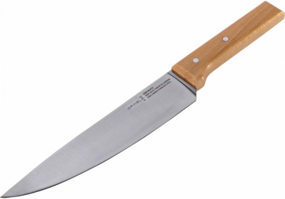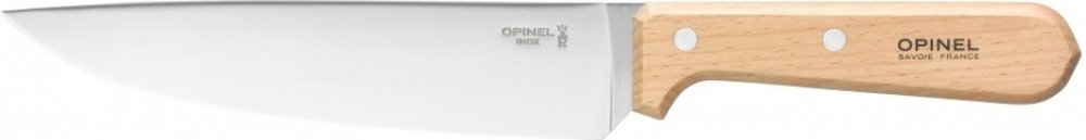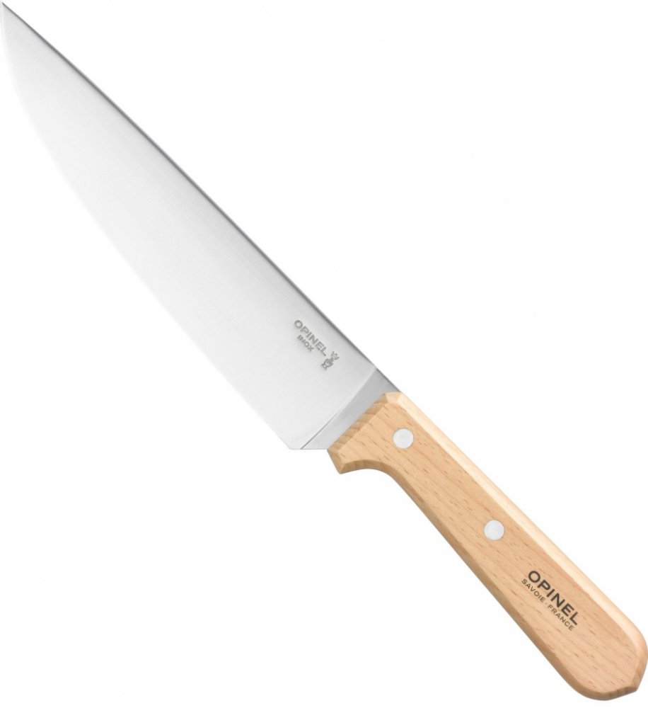 Kuchyňský nůž Opinel s 20 cm čepelí vyrobenou z vysoce kvalitní švédské nerezové oceli Sandvik, odolné proti zkroucení.