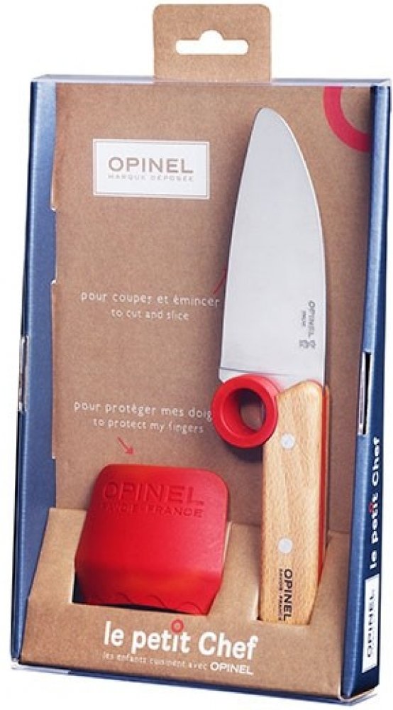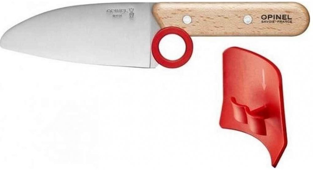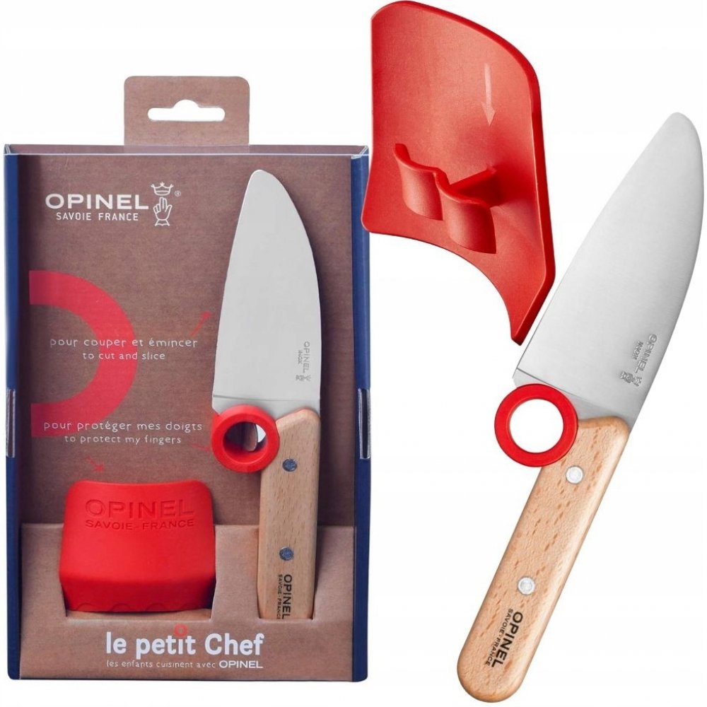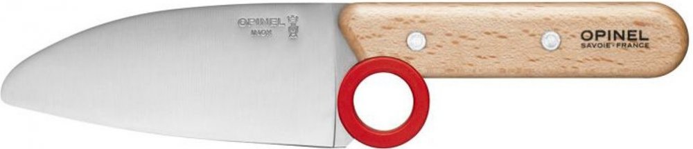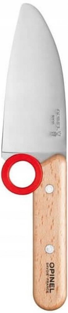 Dětský kuchařský nůž Opinel Le Petit Chef je navržen speciálně pro malé kuchaře, kteří se učí vařit. Nůž má kulatou špičku a praktický ochranný kroužek, který předchází sklouznutí prstů k čepeli. Materiál čepele je vysoce kvalitní švédská ocel 12C27 Sandvik, odolná vůči korozi. Rukojeť je vyrobená z nýtovaného bukového dřeva. Nůž je snadno udržovatelný díky příměsi chromu, která zajišťuje, že hrana nože zůstává ostrá i při styku s tvrdým materiálem, bez nutnosti častého broušení. Rozměry čepele jsou 10 cm. Tento dětský nůž je ideální pro bezpečné a zábavné seznámení dětí s kuchyňskými pracemi.