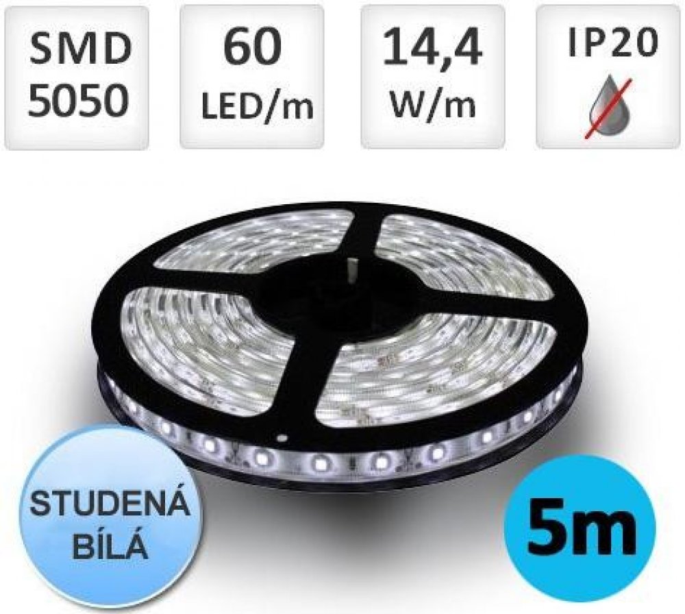 LED pásek řady PREMIUM, osazený 60 kusy LED čipů 5050 na 1 metr, příkon 14,4W/metr. Napájení 12V.Pokud chcete, aby Vám LED pásek sloužil opravdu dlouho, je potřeba jej nalepit na hliníkovou lištu-profil, který zajistí, že se pásek nebude zbytečně přehřívat. V naší nabídce naleznete hliníkové (ALU) profily pro každou instalaci.SMD 5050 LED je trojdiodový čip s povrchem o velikosti 5 x 5 mm a příkonem 0,24 W. Díky výborné svítivosti a rozptylu světla 120° se tento SMD čip začal používat ve velkém a vytlačil starší klasické LED, oproti kterým má až 6-ti násobně vyšší svítivost . Technické údaje:Počet LED60 x SMD typu 5050 na 1 metrPříkon14,4W / mNapájení12V - napětí stejnosměrné, stabilizovanéBarva světlaStudená bíláTeplota světla | Barevné podání6000 K (Cold White) | Ra>80Světelný tok, lumeny720 lm/mRozměršířka 10mmÚhel svícení120°Životnostmin. 35.000 hodin | 100.000 ON/OF cyklůCertifikátyCE, RoHSTřída krytíIP20 - není voděodolnýSpodní částsamolepící značková fólie 3MProvozní teplota-30°C / +50°CDělitelnostlze stříhat každých 5cm* NÁVOD NA MONTÁŽ *UPOZORNĚNÍ: U každého LED pásku dochází s jeho délkou k postupnému úbytku intenzity světelného toku LED diod. Děje se tak v důsledku napěťových ztrát na vodičích v pásku. Delší instalace LED pásků je proto nutné rozdělit na úseky se samostatným napájením. Lze použít více zdrojů nebo přivést k dalšímu úseku napětí od zdroje novým kabelem. U kratších délek pod 10m je ideálním řešením přivést napájecí napětí na oba konce LED pásku. Nabídku napájecích zdrojů naleznete ZDE.Doporučená maximální délka jednoho samostatně napájeného úseku je u tohoto pásku 5m.LED pásky představují moderní, stylové a přitom úsporné řešení osvětlení v interiérech i exteriérech.Instalace LED pásků je snadná. Jedná se o samolepící pásek, který je osazen SMD LED diodami. LED pásek je díky své konstrukci velmi dobře ohebný a výborně se tak hodí pro osvětlení i takových míst, kde by jiné zdroje světla neuspěly. LED pásky se v praxi používají k osvětlení kuchyňských linek, stropních podhledů, soklů, skříněk, akvárií, barů a podobně. Ovládání LED pásků je za pomocí ovladačů, stmívačů, či kontrolerů velice jednoduché a variabilní.V levém menu našeho e-shopu naleznete odkazy na napájecí zdroje a další příslušenství.