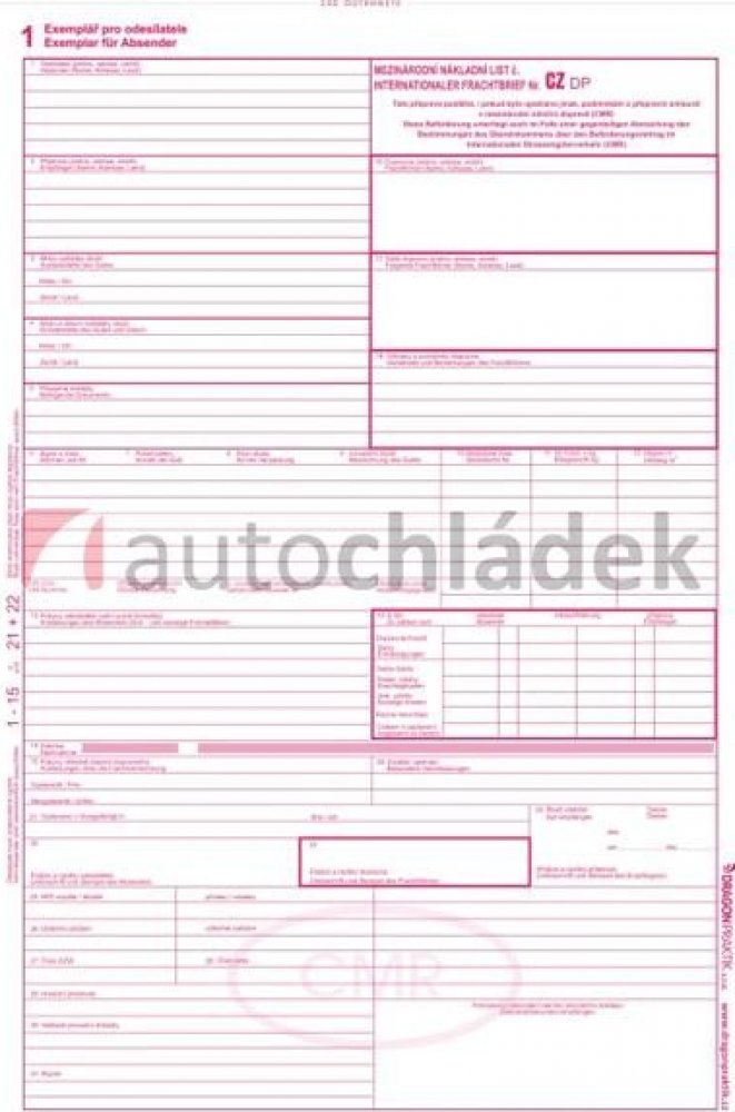 Základní jízdní dokument pro přepravu zboží v mezinárodní silniční dopravě. Jedná se o CMR bez potisku tzv. čistý CMR.