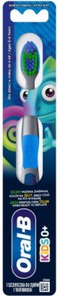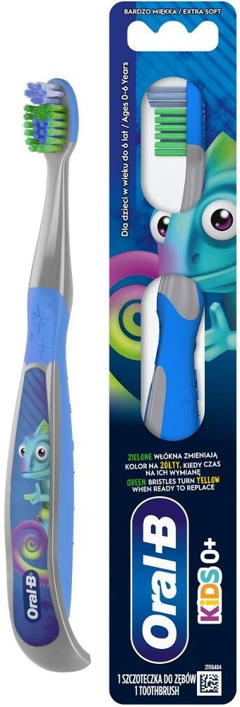 S kartáčkem ORAL-B KIDS 0+ si uděláte z čištění zubů neobvyklé dobrodružství. Tento manuální kartáček je určen speciálně pro batolata a děti do 6 let. Má měkkou hlavu, která chrání dásně, a extra měkká vlákna Power Tip. Vestavěná část na čištění jazyka odstraňuje bakterie z jazyka a sliznice tváří a inovativní technologie změny barvy vás upozorní, kdy je třeba kartáček vyměnit.