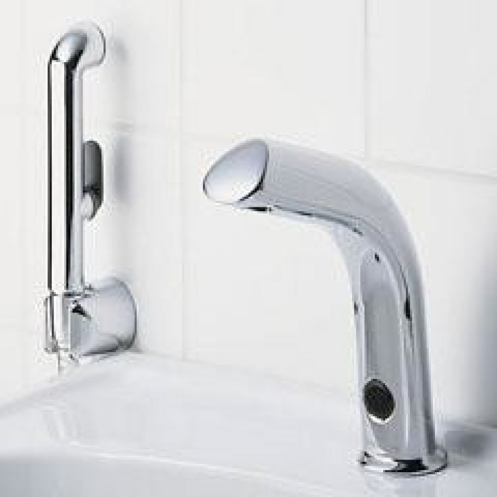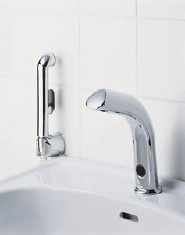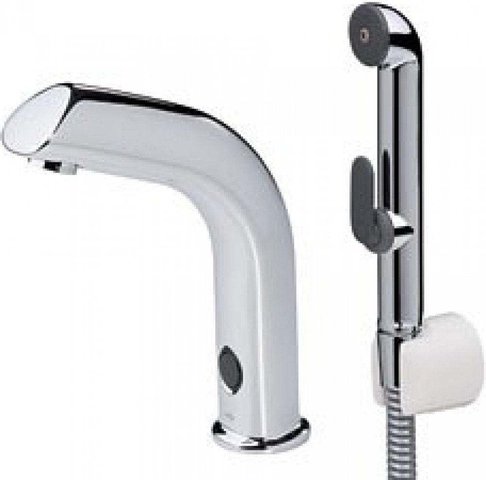 Bezdotyková baterie se směšovacím ventilem. Baterie je vybavena kontrolou průtoku 0.1 l/s. Předem nastavená doba dodatečného průtoku vody (po ukončení mytí) je 1 vteřina. Jestliže je senzor zakryt déle než 2 minuty, baterie uzavře průtok vody automaticky. Napájení 230 Volt.Použití ruční víceúčelové spršky:Sejměte ruční spršku z držáku a stlačte tlačítko na spršce. Proud vody se automaticky zastaví...