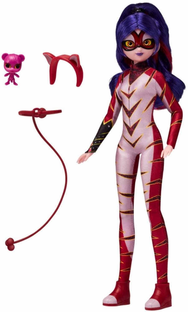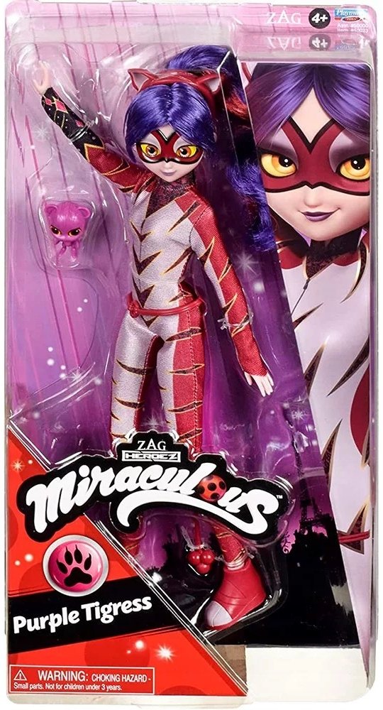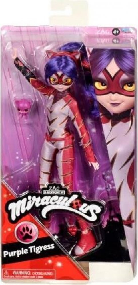 Panenka z oblíbeného seriálu Miraculous: Beruška a černý kocour. Panenka je díky mnoha kloubům dokonale pohyblivá. Přiložené příslušenství zpříjemní zábavu. Vlastnosti výrobku : ✔️ Věk: 4+ ✔️ Velikost panenky: cca 26 cm Vítejte ve vesmíru Miraculous! Pokud vaše dítě sleduje osudy Berušky a Černého kocoura se zvláštní pozorností a netrpělivě očekává další díl této kreslené pohádky, darujte mu speciální dárek - panenku, která představuje Julku jako Fialového tygra! Když totiž Juleka použije Zázračného tygra, promění se ve Fialovou tygřici - novou odvážnou superhrdinku! Panenka je 26 cm vysoká a má na sobě superkostým Fialové tygřice s fialovými tygřími pruhy, červenými detaily, odpovídající maskou a odnímatelnými botami! Použij její doplňky a bojuj se zlem! Pomoz Purpurové Tygřici zastavit Pána temnoty pomocí její čelenky, speciálního opasku a Kwamiho jménem Roarr. Kwami jsou kouzelná stvoření, která pomáhají majitelům Miraculy uvolnit zvláštní síly. Díky Roarrovi se Juleka může proměnit ve Fialovou tygřici a zasadit mocný úder padouchům! Krásné detaily! Panenka Fialová tygřice byla navržena tak, aby se podobala postavě známé ze seriálu - má realistické rysy obličeje a výrazy. Úžasné účesy! Krásné fialové vlasy Purpurové Tygřice jsou upravené do dlouhého culíku s výraznými červenými melíry. Pěkná čelenka! Doplň oblečení Purpurové Tygřice čelenkou s tygříma ušima!