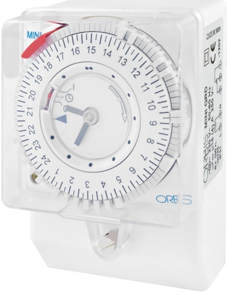 Hodiny spínací MINI QRD, analogové (mechanické), denní program (24 hodin), rozměry 100x69mm, napájecí napětí 230V 50-60Hz, max. spínaný proud 16A, nejkratší spínací interval 15 minut, se zálohou chodu 100 hodin, přípustná teplota okolí -10°C až +45°C, bílá barva, časová základna - QUARTZ (křemíkový oscilátor), pro montáž na panel, připojení vodičů pomocí šroubových svorek, krytí IP20 podle DIN EN 60529
