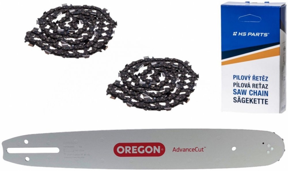 Co je rozteč? Dělení neboli rozteč řetězu - tj. se rozumí vzdálenost mezi kterýmikoli třemi po sobě následujícími nýty dělena dvěma, vyjádřeno v palcích. OREGON vyrábí pilové řetězy s roztečí 1/4 ', .325', 3/8 ', .404', 3/4 '. Rozteč musí být shodná pro všechny prvky řezacího systému (pilový řetěz, vodící lišta a řetězka). V případě tohoto řetězu je to 3/8' - malá (Hobby) palce (vzálenost mezi třemi nýti je tedy přibližně 16,5mm). Důležité! U již použitých řetězů může být tato vzálenost větší v důsledku opotřebení řetězu. JAK SE MĚŘÍ DÉLKA LIŠTY