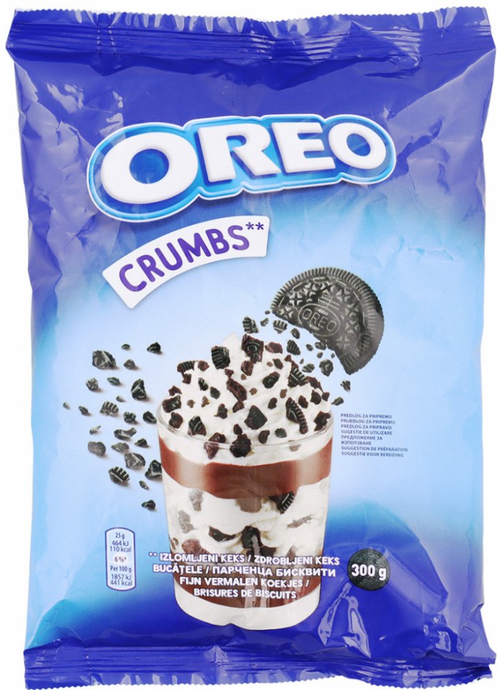 Kousky oblíbených kakaových sušenek Oreo k posypání vašeho oblíbeného mléčného nápoje, dortu... Složení: pšeničná mouka, cukr, rostlinné oleje (palmový, palmojádrový), kakaový prášek se sníženým obsahem tuku (6,5%), glukózo-fruktózový sirup, pšeničný škrob, kypřící látky (uhličitany draselné,, amonné a sodné), jedlá sůl, emulgátor (sojový lecitin), aroma. Může obsahovat stopy mléka. Výživové údaje na 100 g: Energetická hodnota 1855 kJ / 464 kcal, Tuky 14 g, z toho nasycené mastné kyseliny 6,3 g, Sacharidy 71 g, z toho cukry 28 g, Vláknina 3,7 g, Bílkoviny 6,3 g, Sůl 1,24 g.