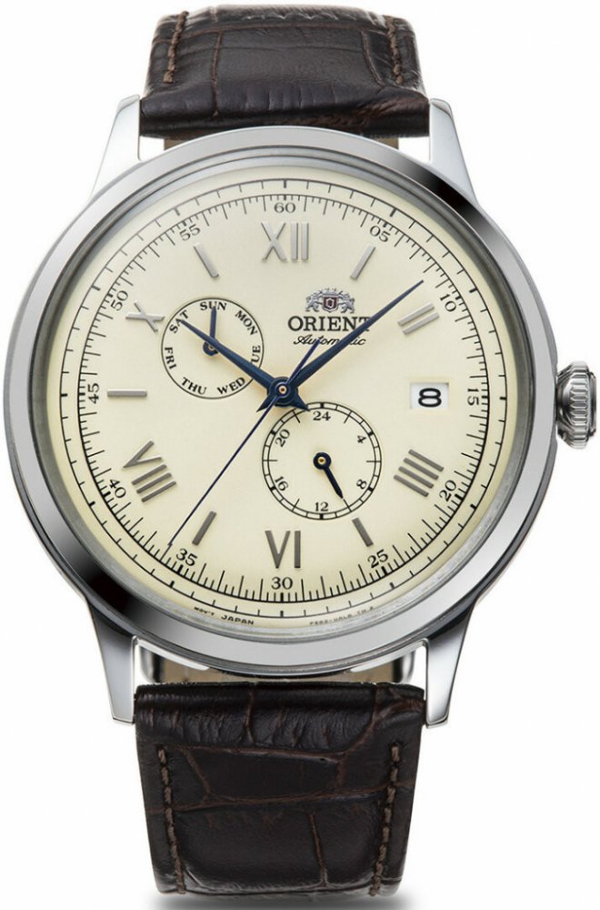 Orient Bambino Automatic RA-AK0702Y30B Pánské multifunkční hodinky - Pouzdro z nerezové oceli, stříbrná povrchová úprava, leštěné- Kožený řemínek, hnědý, spona na druk- Automatický strojek, natahování strojkem- Ukazatel dne v týdnu, datumovka, 24hodinový ukazatel- Malá vteřinovka- Žlutá barva ciferníku- Vodotěsné- Šířka pouzdra cca 40 mm- Výška pouzdra cca 11 mm Dodáváno s krabičkou.